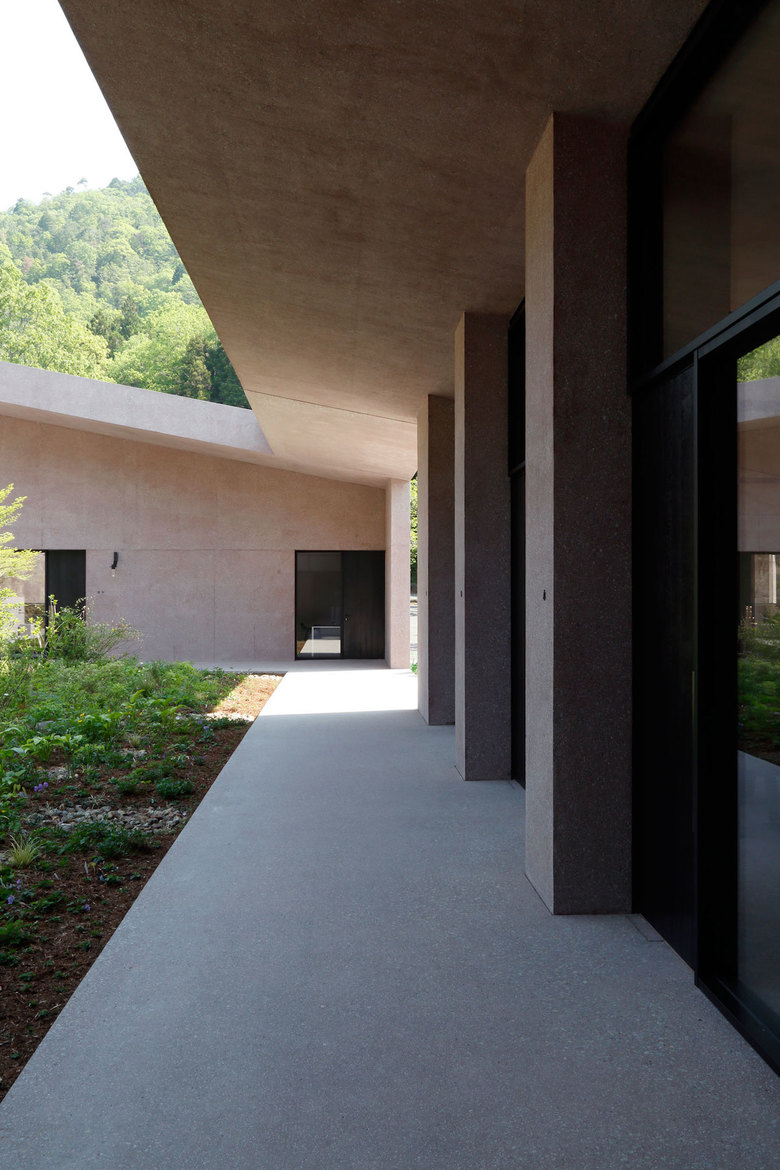 The floors, walls and roof are formed as pure building elements and poured from the same earth-like red coloured concrete – honed for internal floors and ground and sandblasted for walkway walls and soffits – giving the overall structure a monolithic appearance. A range of furniture designed specifically for the project consisting of simple, informal painted wooden chairs, benches, tables can be re-arranged depending on the occasion.