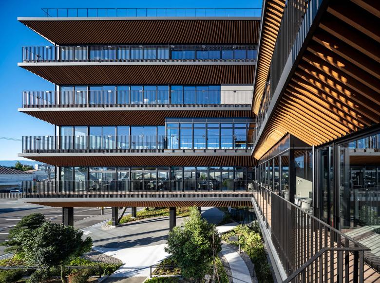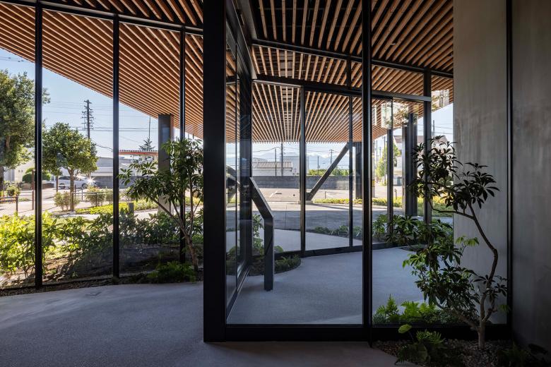The full-glass façade provides views of the surrounding industrial park, the Jintsu River to the west, and the Tateyama mountain range to the east. An outdoor deck wraps around the façade and provides a buffer to the perimeter of each upper floor. Interior ceilings are fitted with louvers made of Japanese pinewood, and the louvers extend outward and adorn the eaves above each deck. The resulting space has a warm natural feel like being under tree cover.