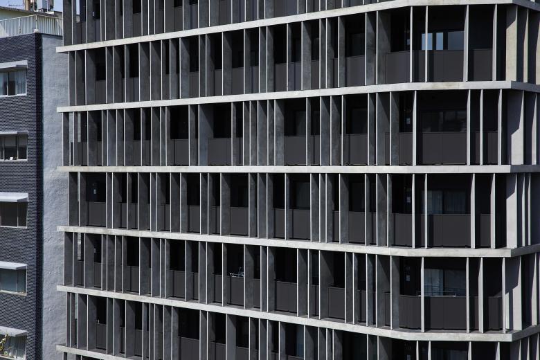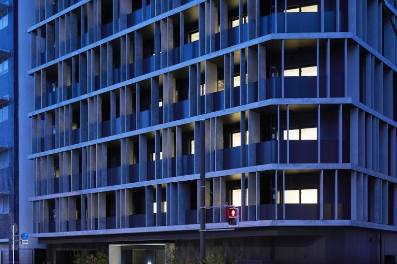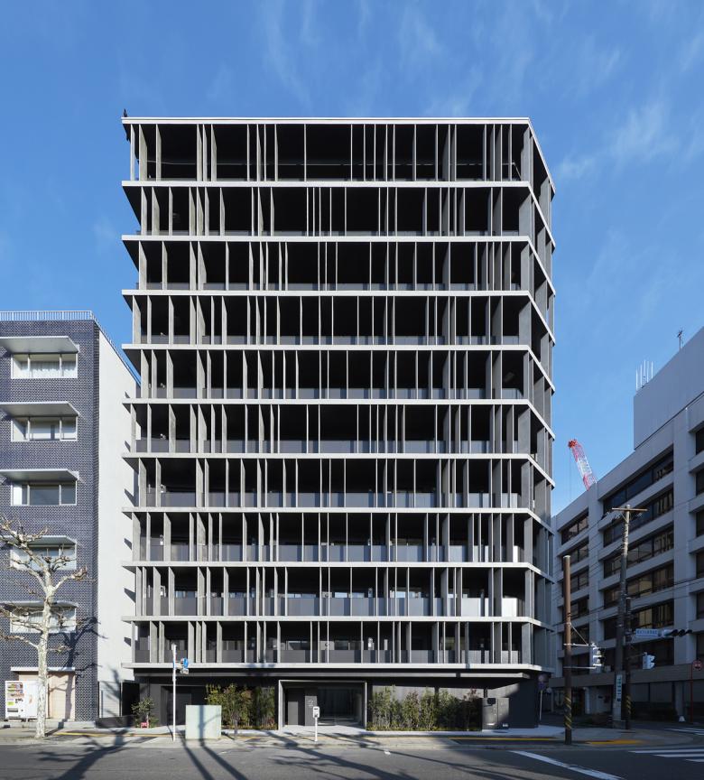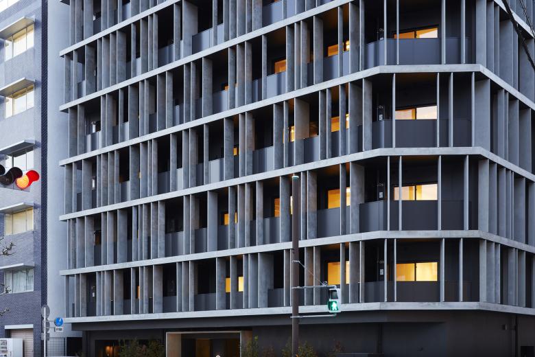 The concrete fins on the facade are made with Hybrid Prestressed Concrete or HPC. They have been developed and patented by the Japanese company HPC Okinawa in 2015. The panels used in this housing block have been manufactured by Kooge Concrete company in Tottori prefecture, south of Japan.
