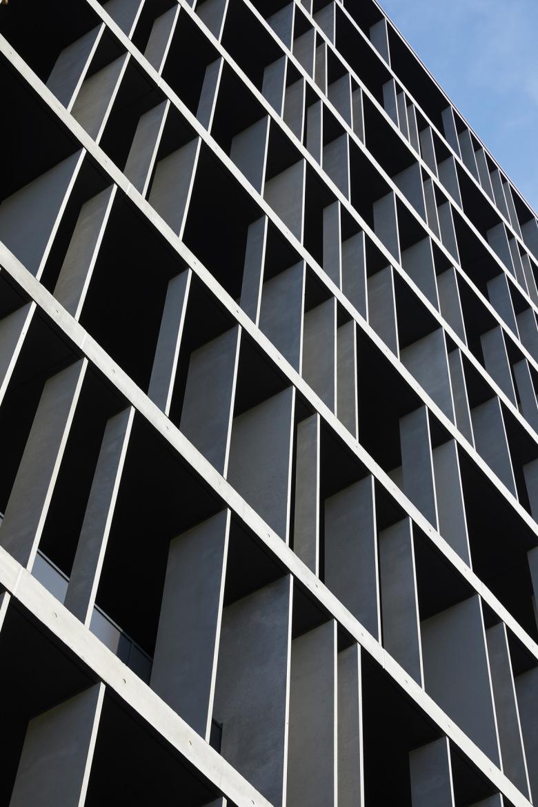The vertical concrete panels have been added to the facade randomly, concealing the small units behind them. Panels, thin as they are, are unobtrusive, befitting the scale of the individual units. Each unit has a width of just 2.9 meters. The depth of panels vary between 200mm to 900mm, with some functioning as brise-soleil and some as dividing walls between different units, whilst others are more decorative, framing views of the city.