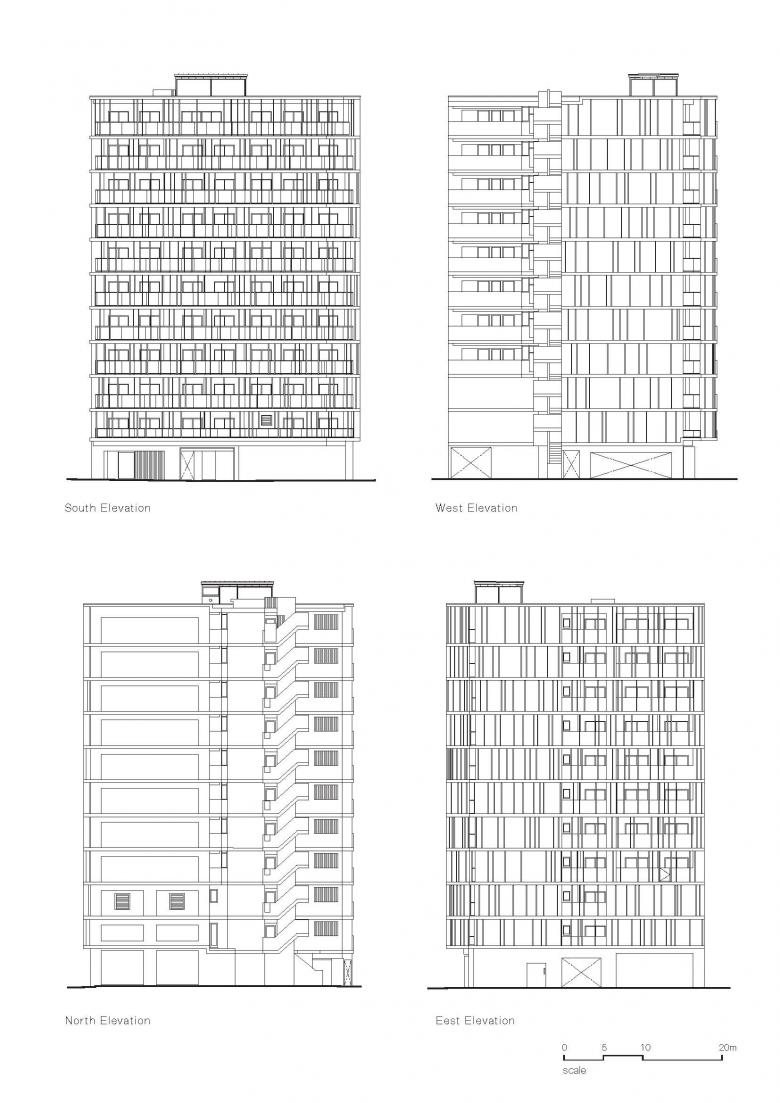 In Japan, balconies are almost obligatory for mansion blocks as a mean of incorporating escape ladders to avoid excessive internal staircases, allowing for more space for individual flats. This results in them looking formulaic and monotonous. The concrete fins are deliberately made not to reflect the internal structure. Thin calcium silicate boards are discreetly tucked away behind these fins. In case of emergencies, they can be pushed down easily and the residents can escape using the escape ladders installed on each floor.