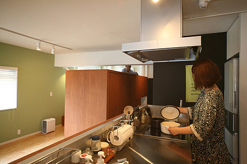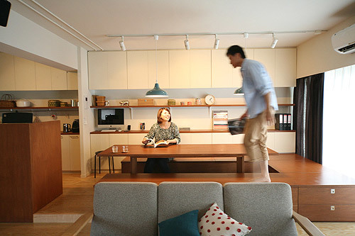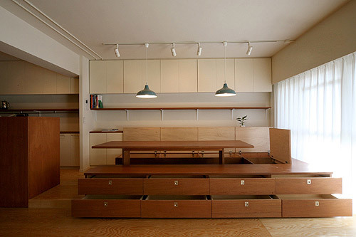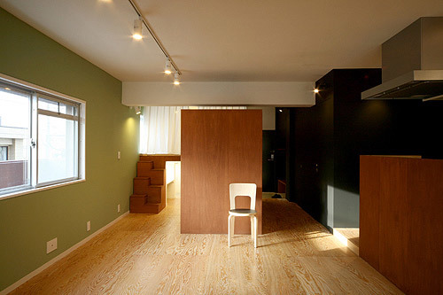This flat is part of a project to fully renovate a 21-year-old building formerly used to house company employees. Aside from the kitchen and bath, the unit is a completely open skeleton that can be molded to the needs of the residents by rearranging various items of furniture. By changing the height of the floor, however, we were able to create gentle partitions within the open space. Examples include the spacious living area and raised sleeping area with storage space and plumbing underneath, the sunken “kotatsu”-style dining area, and the open kitchen.