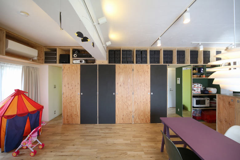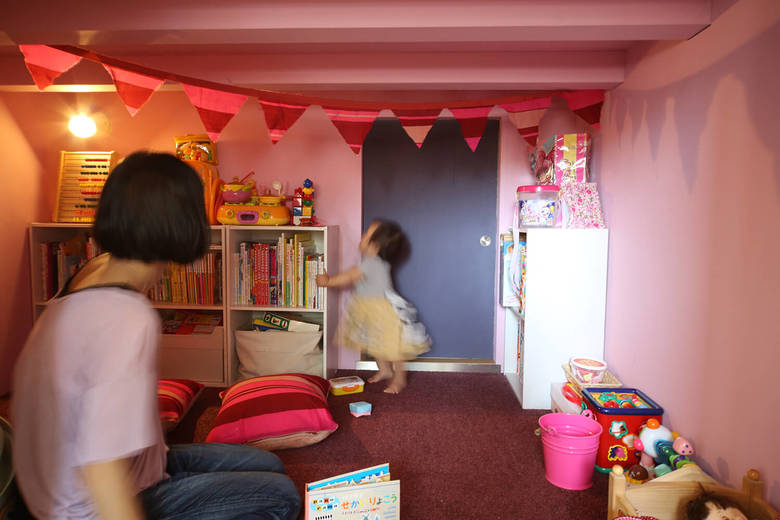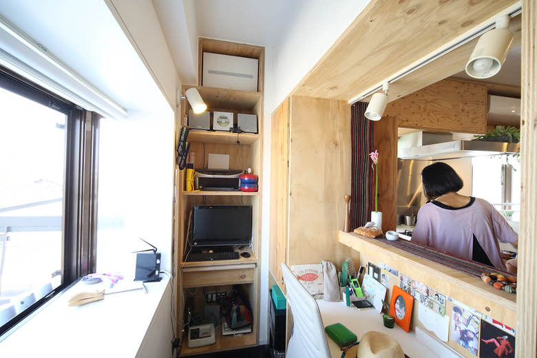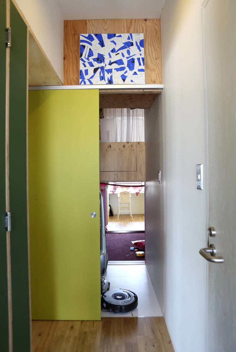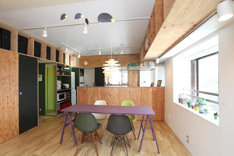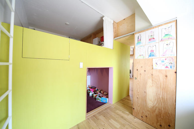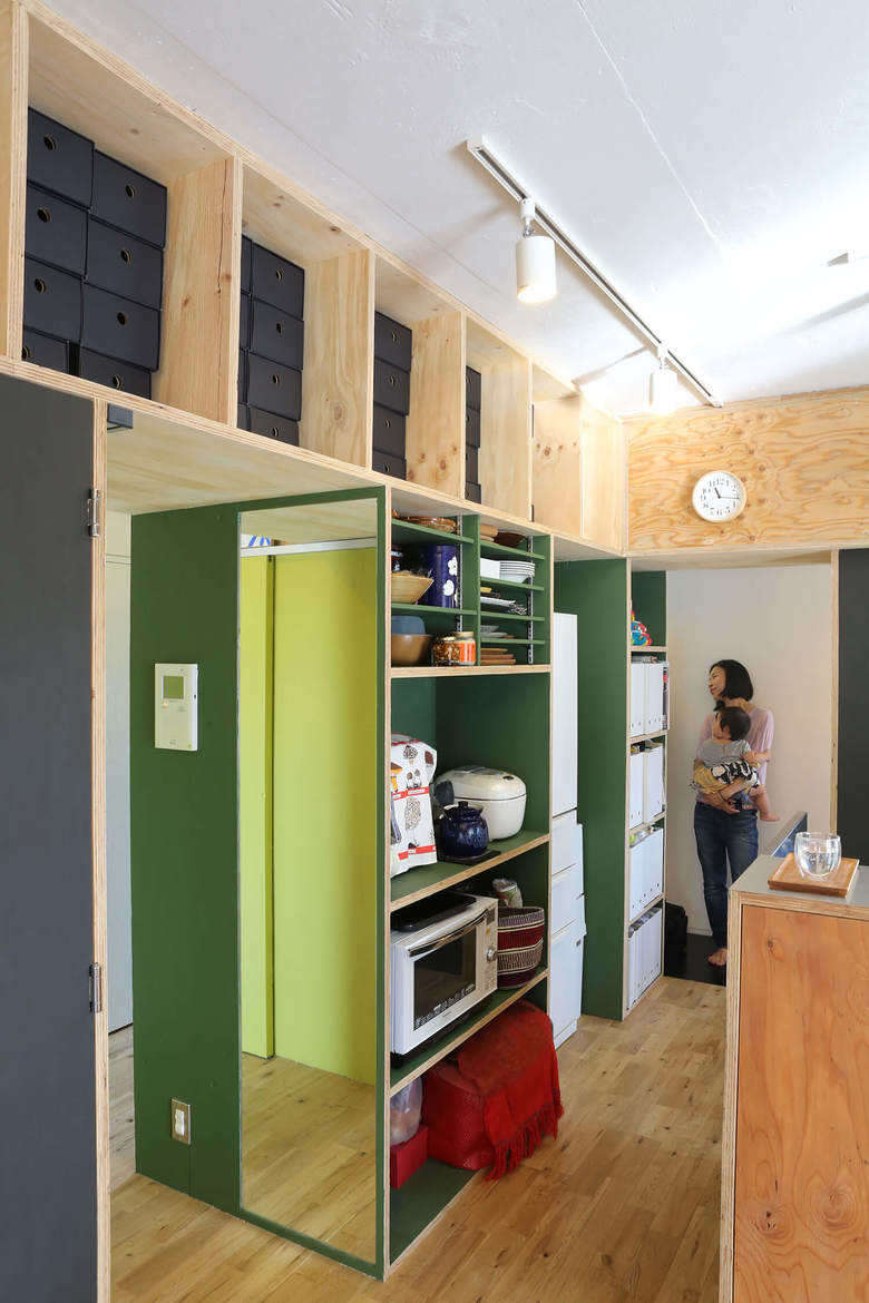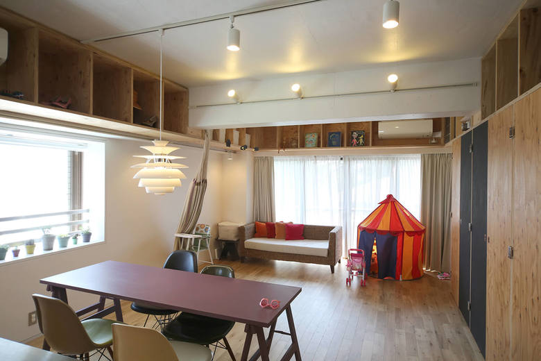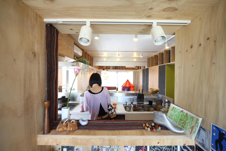 This is one of the flats of the 26 years old used condominium designed for a couple and their children. Adjacent to the entrance is the atelier for the wife. This atelier is set right behind the kitchen as an individual space, however, the wide opening in front of the table allows one to look towards the kitchen and the living room. Also, the roof terrace is visible from the living room through this opening. The bed room is raised in order to create another space beneath, which can optimize the circulation from the kids study to the entrance with a wicket door. Several circulation roots are implemented to create a feeling of distance between the spaces so that a certain amount of privacy is provided for everyone, but still be able to sense the existence of each other.