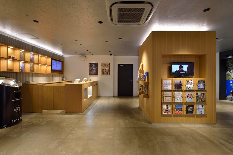 既存の受付のカウンターは部屋になっていて、スタッフがロビー全体を見渡すことが出来なかったため、壁をとって、オープンな受付カウンターとした。このカウンター、ロビー中央に位置する柱周りの展示棚やベンチは明るめの木材の仕上げとして、空間全体の中のアクセントになっている。