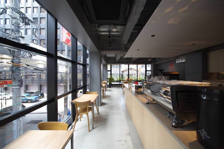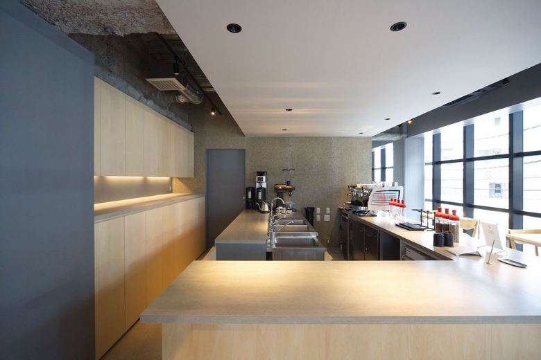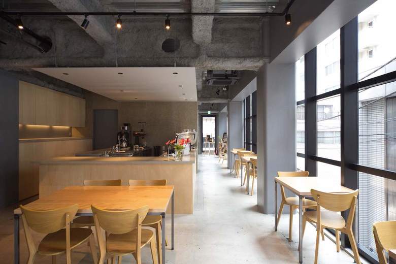 カウンターの奥は可動式のテーブルを配置、作業人数によってレイアウトを調整できるようにし、窓を開けるとテラスと連続してテーブルを配置することもできる。作業が終わると、全体を客席として利用することもできる。