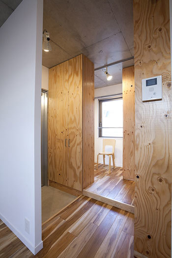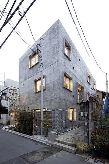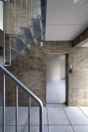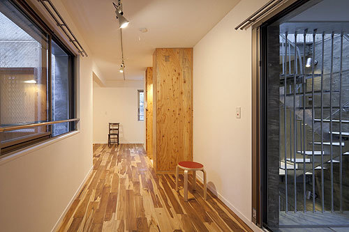 This housing complex consists of 9 one-room units measuring approximately 20㎡and 3 units measuring approximately 30㎡. The L-shaped design of the building as a whole secures an open space between the entryway and street, while two tree-shaped voids inside the building allow for a compact arrangement of balconies and walkways between units. The voids provide ventilation because they are oriented towards gaps in the densely-developed residential neighborhood surrounding the building; the chimney effect produced by the tall, tree-shaped voides further enhances air circulation. Light also pours in through the top of the voids. The units have a diverse range of floor plans, including I, L, C, T, and other shapes that wrap around the voids. Standout features of the exterior include concrete poured in larch plywood formwork and hot-dip galvanized metal window frames.