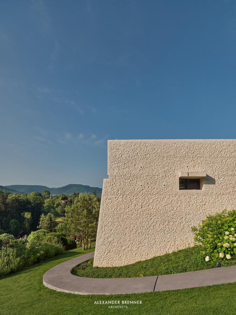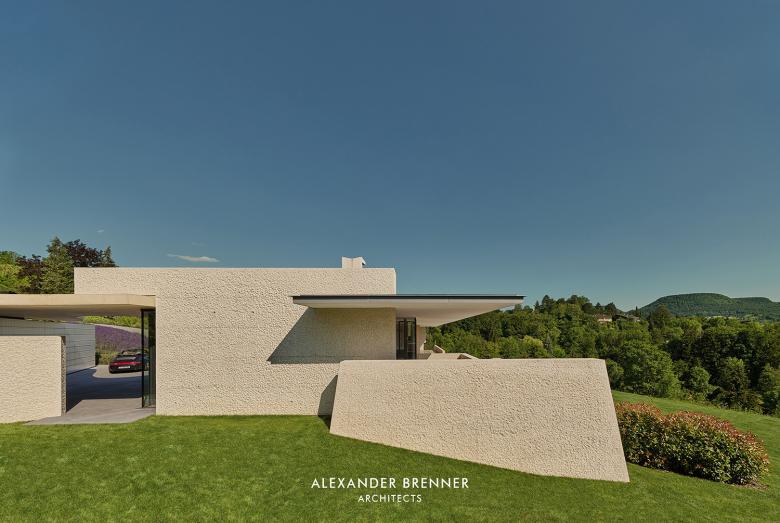 The modern villa was built on a plot of land on the outskirts of Reutlingen on a popular mountain trail, directly below the Achalm Mountain. To the north, towards this path, it appears like a stone, solid and closed and opens with floor-to-ceiling glazing to the view in the south. Here the view wanders over the pool and the wide valley. For energetic reasons and for reasons of sustainability, the outer walls consist of 50 centimeter thick aerated concrete and a refined exposed concrete shell of 25 centimeters. By adding local Jura chips as aggregate, it appears in a warm gray beige after refining. The façade, handcrafted by chiseling, pointing and charring, presents itself with a rough, archaic relief structure. Inside, too, stonemasons created a very special atmosphere thanks to the bush-hammered concrete on fixtures, stairs and parapets, which is reminiscent of the stone power of historical buildings. The calming feeling of firmness and durability is encouraged by limed walls, natural stone and oak flooring.