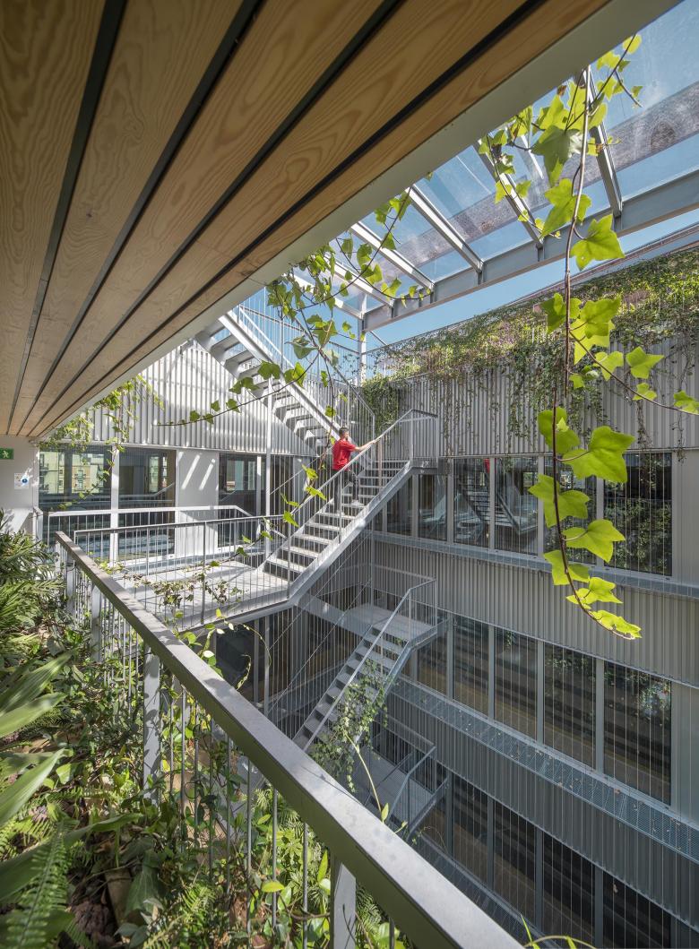 The design introduces a stepped green courtyard, enhancing daylight and natural ventilation throughout the interior spaces. The terraced section optimises light penetration on every floor and creates outdoor terraces that extend the work areas with new spaces for meetings and informal gatherings. A new staircase within the courtyard strengthens vertical connectivity between floors and encourages healthy habits, with vegetation taking a central role in the experience. The ground floor is conceived as an extension of the public realm, articulated through a multifunctional lobby integrating reception, bicycle parking, foyer, and auditorium, with the green courtyard serving as the central feature and backdrop.