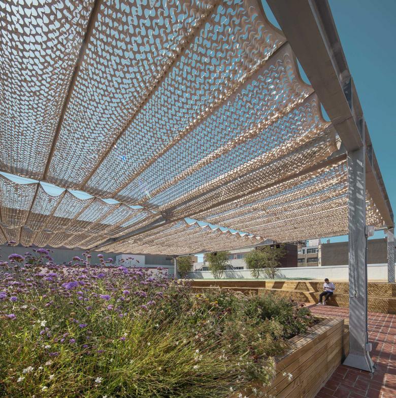 Flexible workspaces are arranged around the new central courtyard on the typical floors, fostering a connection with the terraces and greenery. The layout centres on an open-plan workspace, flanked by side strips housing circulation cores, services, meeting rooms, offices, and break areas. The roof is conceived as a productive, active space, combining a main terrace linked to the courtyard and the Zamora Street façade—designed for social interaction and relaxation amid vegetation and shaded by adjustable canopies—with a technical zone accommodating building services and photovoltaic panels integrated into the existing pergola.