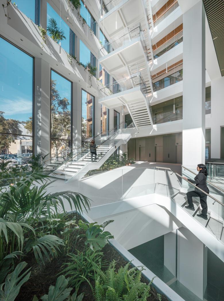 The six-storey atrium, filled with natural light, serves as a hub for circulation and interaction between the building’s levels. Beyond functioning as the central vertical circulation core, the atrium encourages social and professional engagement among occupants. The ground floor offers an open-plan space suitable for both office and commercial use, with direct access from the street.