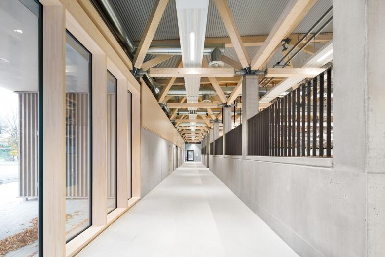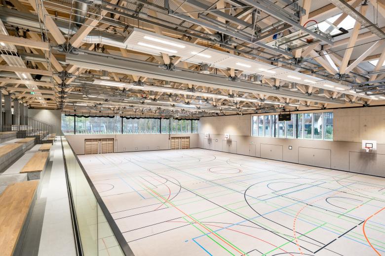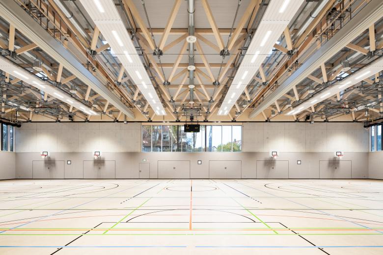 Die Stadt Nürnberg beabsichtigte den Neubau der Grundschule im Stadtteil Thon mit Mittagsbetreuung und Kinderhort sowie einer Turnhalle mit Außenanlagen auf dem Bestandsgelände der Grundschule Thoner Espan. In zwei Bauabschnitten wurde dafür die bestehende Grundschule und das Schul-Containerprovisorium, eine provisorische Kindertagesstätte und die Bestandsturnhalle rückgebaut. Im 2. Bauabschnitt schaffte der Abbruch des Altbaus und der benachbarten Container Raum für Stellplätze, einen Allwetterplatz, einen Schulhof, eine Laufbahn mit Sprunggrube und die neue Dreifachturnhalle. Ihr vergleichsweise großer Baukörper wurde dabei bewusst in die durch den Abbruch vorhandene Baugrube abgesenkt. Das Bauvorhaben wurde so optisch auf minimale Außenmaße begrenzt. Zugleich bringt die Verglasung zu Vorplatz und Straße eine belebte Atmosphäre statt einer verschlossenen Turnhallenoptik. Durch die Absenkung des Baukörpers befindet sich der Zugang zum Obergeschoss der Turnhalle auf Erdgeschossniveau. In einem vorspringenden Bauteil liegt zentral der Haupteingang nebst flankierenden Sanitärbereichen für BesucherInnen sowie zwei Außenspielgeräteräumen. Von hier erreicht man barrierefrei über einen Aufzug das Untergeschoss oder nach dem Windfang das Foyer. Zwischen Foyer und Halle befindet sich die Tribüne für bis zu 200 ZuschauerInnen auf drei Sitzstufen. Die Turnhalle ist durch doppelschalige Trennvorhänge in drei Hallenteile trennbar. Jedes Hallendrittel ist über eine Umkleideeinheit mit zwei Umkleiden und jeweils direkt zugeordnetem Wasch- und Duschraum zugänglich. Diese Struktur von insgesamt sechs separat nutzbaren Umkleiden erlaubt die optimale Nutzung der Halle im Schulsport (Geschlechtertrennung bei bis zu drei Klassen) sowie flexible Zuordnungen im Vereinssport. In der Hallenmitte ist ein Regieraum mit Durchblickfenster zur Halle angeordnet. Im rückwärtigen Flurbereich liegen getrennte Lehrkräfteumkleiden sowie ein Erste-Hilfe-Raum mit integrierten Nasszellen und SchülerInnen-WC. Ganz links und rechts in den Grundrissen sind zwei Fluchttreppenhäuser angeordnet, über die in Ausnahmefällen (z.B. Bürgerversammlung) ein direkter Hallenzugang oder eine Entfluchtung auf kurzem Weg möglich sind. Das Dach ist als Satteldach ausgeführt, dessen Firstlinie quer zur Halle verläuft und zur Mittellinie der Längsseiten um 5,43 Meter verschoben ist. Nach intensiver Prüfung verschiedener Lösungen der Tragwerksplanung fiel die Entscheidung auf ein räumliches Dachtragwerk aus Brettschichtholz. Die ästhetische und funktionale Ausführung des Holztragwerks bietet zudem Vorteile wie Nachhaltigkeit, hohe Belastbarkeit und Langlebigkeit.