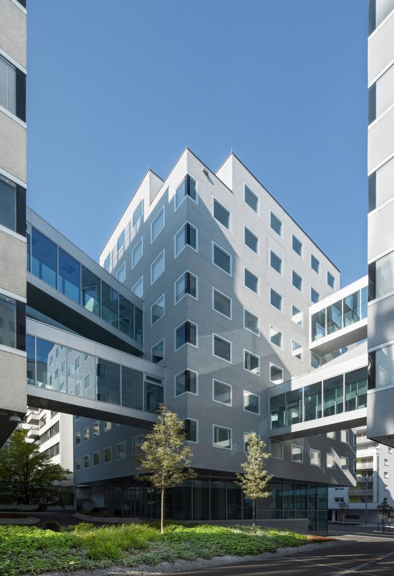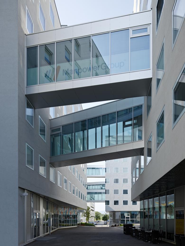 The four buildings can be linked by glass walkways as required, while the floor plans can be freely configured too for open plan or separate offices. The inner courtyards create a pleasant working environment and an attractive setting to talk things over during breaks. High priority has been given to the design of the courtyards between the units and around the exterior of the complex, as well as energy-efficient construction in this LEED and Greenbuilding certified development.