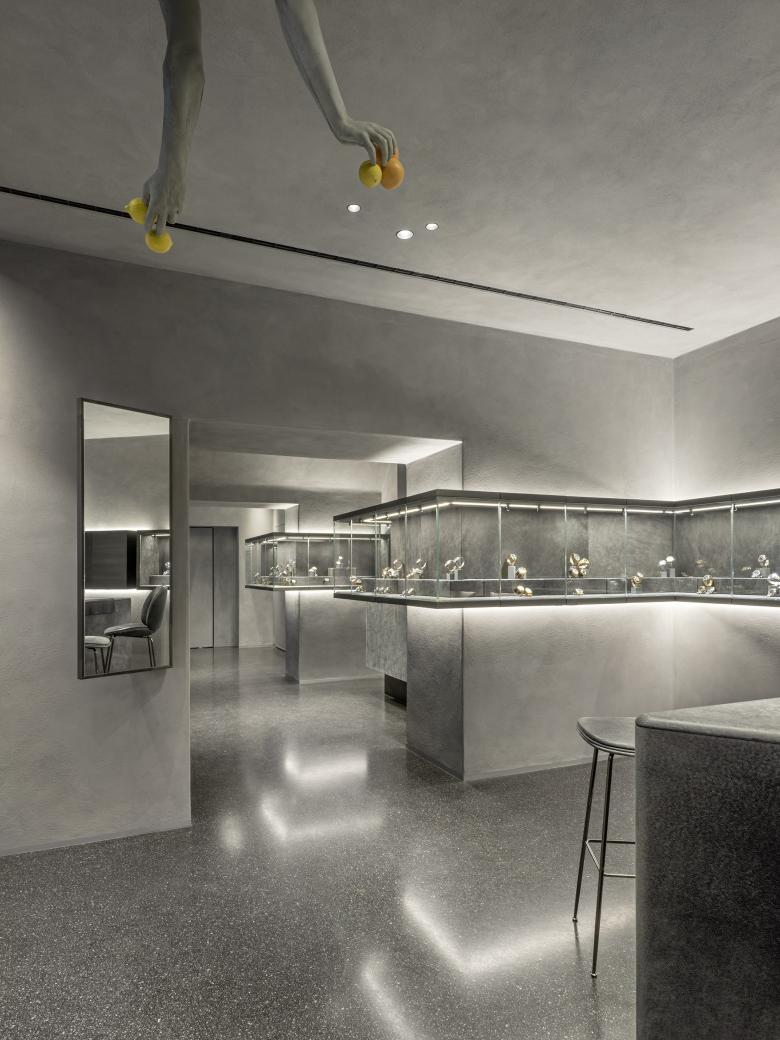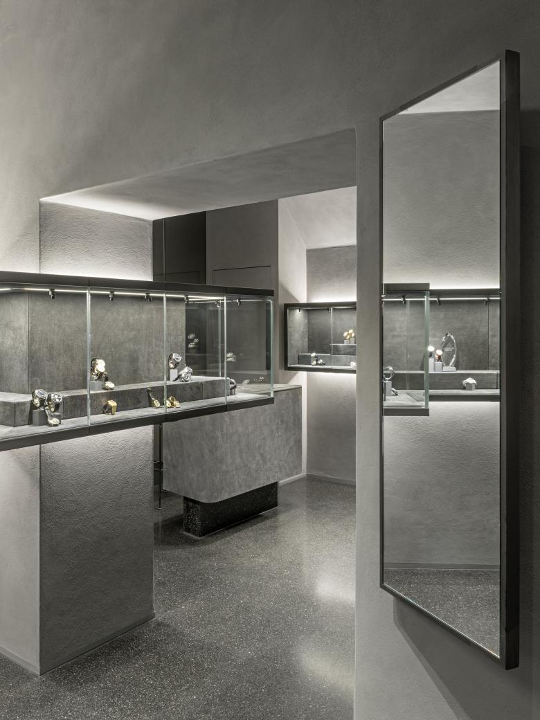 Deliberately earth materials in grey colour strongly strengthen the existing structure and contrast with the subtlety of watches. Leather, rough lime mortar and terrazzo versus smooth, polished, shiny surfaces of watches. This creates a calming and almost holy mood. The most important design elements are deliberately withdrawn, the light that is used emphasises the room. Leather-covered tables look like altars. Here, the customer can look at the selected watch in peace and quiet and get detailed advice. On the other hand, there are showcases, both indoors and outdoors, which maximally present the exhibited watches, supported by digital surfaces that complement the communication.