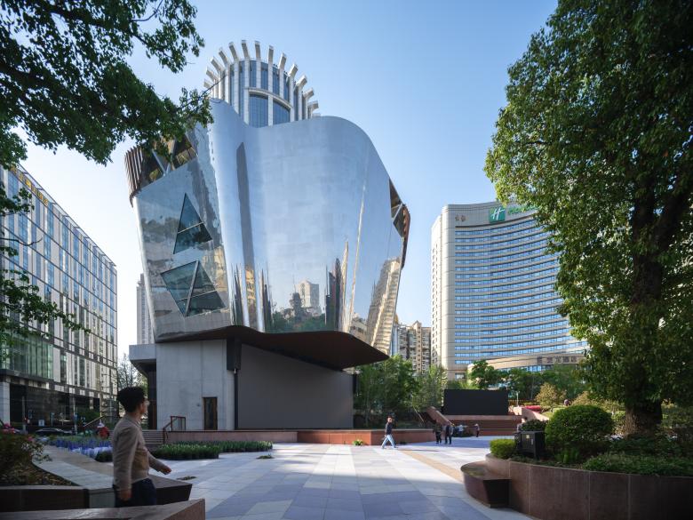 The new design for the very significant “Century Square” at East Nanjing Road in Shanghai, opens like a shell and shows the splendour of its ‘pearl’, a shining kaleidoscope which reflects the new green urban scenery.