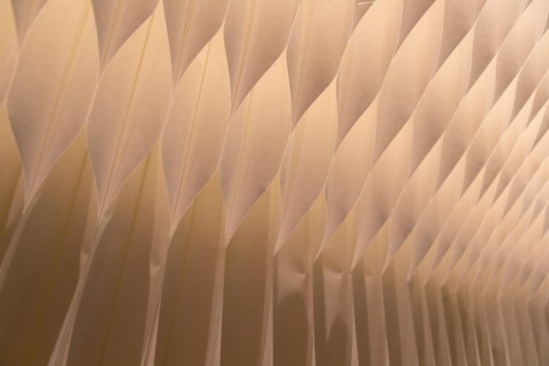The Architecture of Virtual Water is a sinuous pavilion formed by a letter-shaped wooden structures spelling the word AQUA (Latin for water), while the walls are made of upcycled industrial filter paper, assembled with a “honeycomb” technique. These hand-crafted surfaces, produced in Catalonia using solar-powered methods, embody a commitment to sustainability, craftsmanship and experimentation.