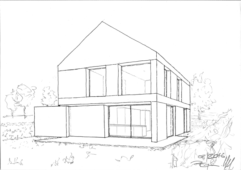 Auf einem schlanken Baugrundstück in Hürth entstand das freistehende Einfamilienhaus für ein junges Ehepaar. Die Umgebung besteht aus klassischen Einfamilienhäusern aus den 1980er Jahren.