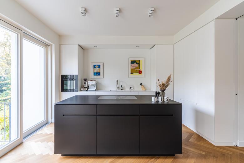 Blick vom Essbereich in die offen gestaltete Küche mit monolithischem Küchenblock