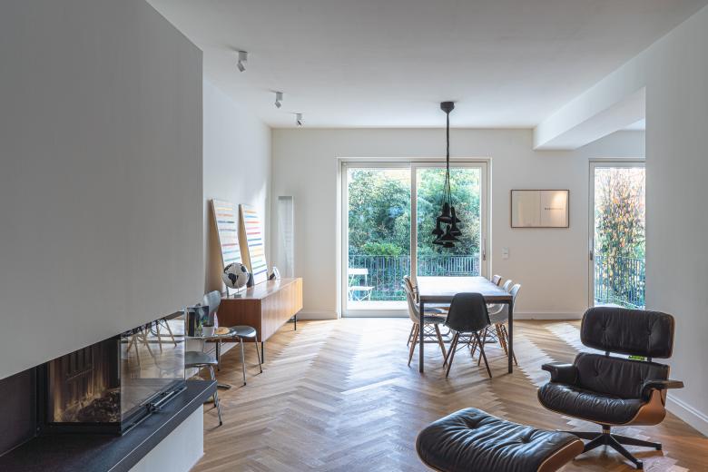 Vom Wohnzimmer aus öffnet sich der Grundriss in Richtung Garten. Der Kamin verbindet Wohnen und Essen.