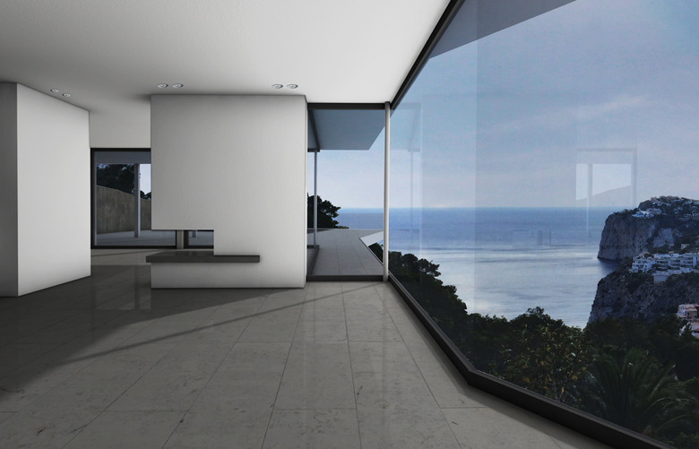 Innenraumperspektive mit Blick auf die Bucht von Cala Lamp