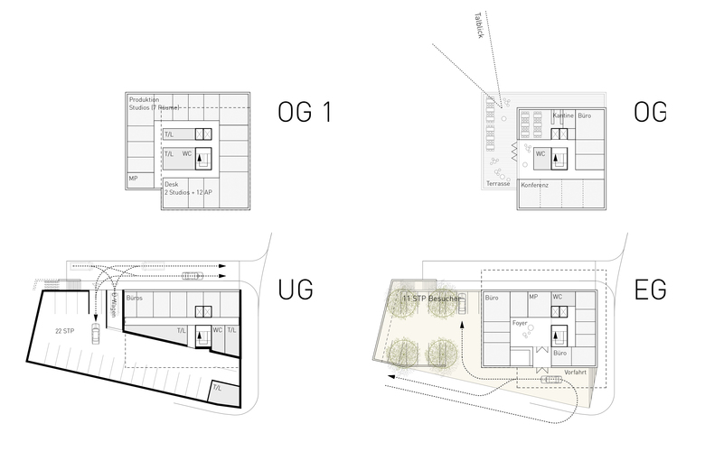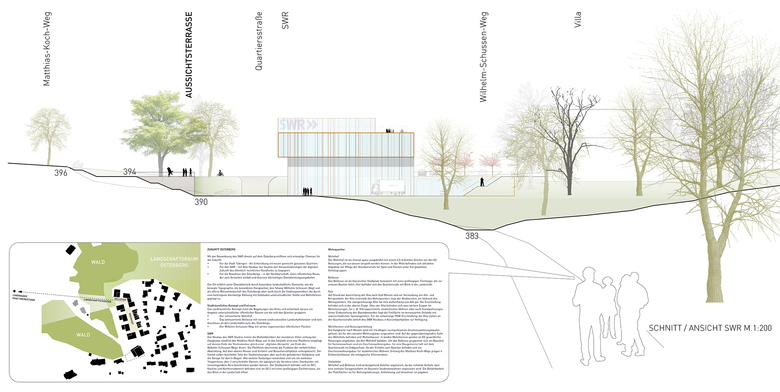 Der Neubau des SWR Studios nimmt die Maßstäblichkeit der mondänen Villen entlang der Hangkante nördlich des Matthias-Koch-Wegs auf. In das Gelände wird eine Plattform eingefügt auf dessen Ende der Studioneubau gleich einer „digitalen Akropolis“ am Ende des Wilhelm-Schussen-Wegs thront. Die Plattform übernimmt die Funktion der verkehrlichen Abwicklung. Auf dem oberen Niveau sind Vorfahrt und Besucherstellplätze untergebracht. Der Sockel selber beinhaltet Teile der Studionutzungen aber auch die geforderten Stellplätze und die Garage für den Ü-Wagen. Alle weitern Nutzungen entwickeln sich um ein zentrales Treppenhaus über 3 verschränkte Ebenen, die typlogisch als Variation eines Zweibundes mit innenliegendem Kern beschrieben werden können. Der Deskbereich befindet sich im OG1, Kantine und Konferenzbereich befinden sich im OG 2 mit einer großzügigen Dachterrasse, die den Blick in die Landschaft öffnet.