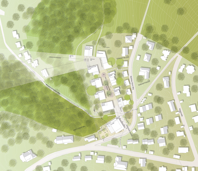 • Das extrovertierte Bellevue mit seinem eindrucksvollen Landschaftsfenster und dem Anschluss an den Landschaftsraum des Österbergs