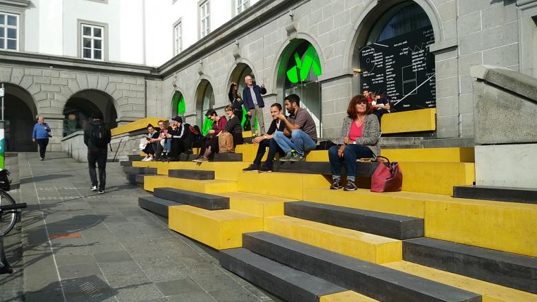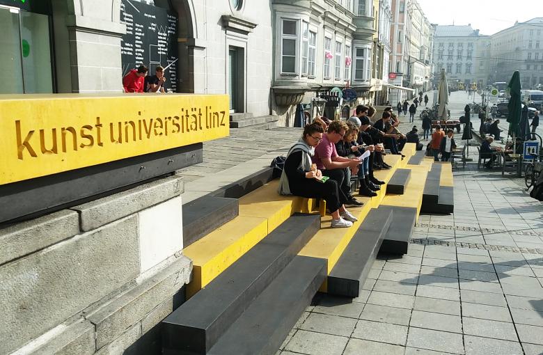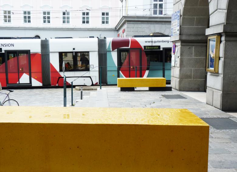 Around 60 colored concrete cuboids in black and yellow adorn the forecourt of the Kunstuniversität Linz on Hauptplatz. Designed by Caramel Architekten, this gift from the Kunstuniversität Linz to all Linzers is intended to invite them to linger and at the same time strengthen the visibility of the educational institution in the urban space. Inspired by the temporary seating steps at the same location during "Linz 09", then also penned by Caramel, this newly created form of street furniture is intended to open up the Kunstuniversität Linz as well as the "splace am Hauptplatz" to the Hauptplatz - and vice versa.