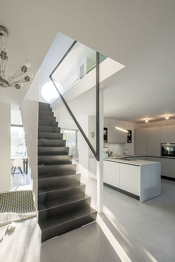 The openly desinged glassed staircase provides light for the playroom which is located in the basement.