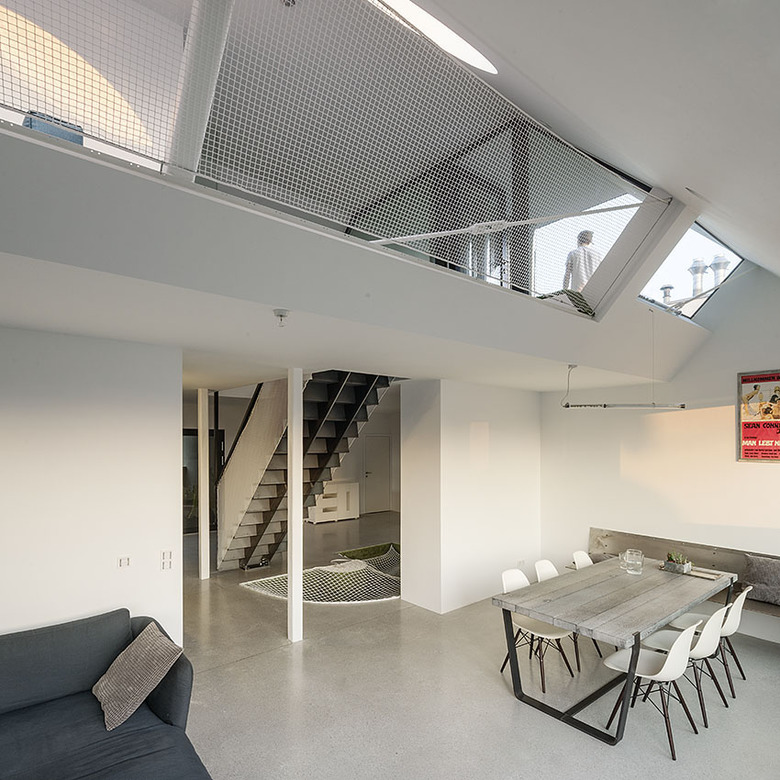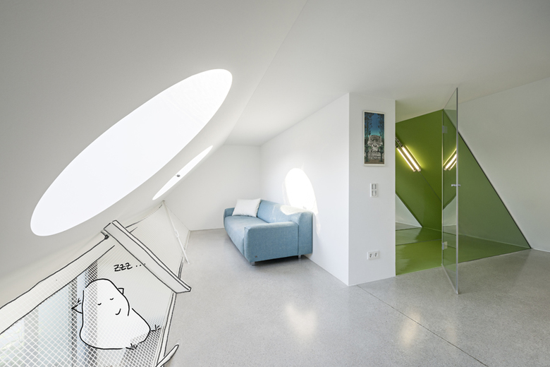 In the attic there‘s a study area flooded with light and a view all over the surrounding gardens and buildings.