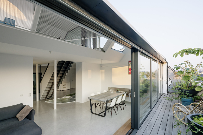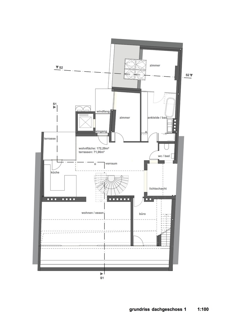 The desire for autonomy and self initiative bears its fruits in countless details and cannot only be gathered from the columnar fruit trees from the different levels. The curious beholder will spot a range cooker here, an almost too simple of a light system there and all kinds of unexpected things.