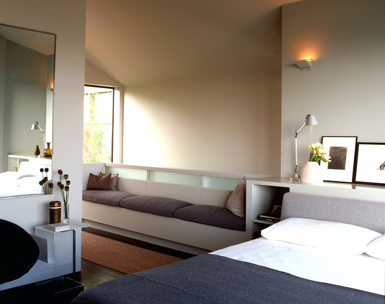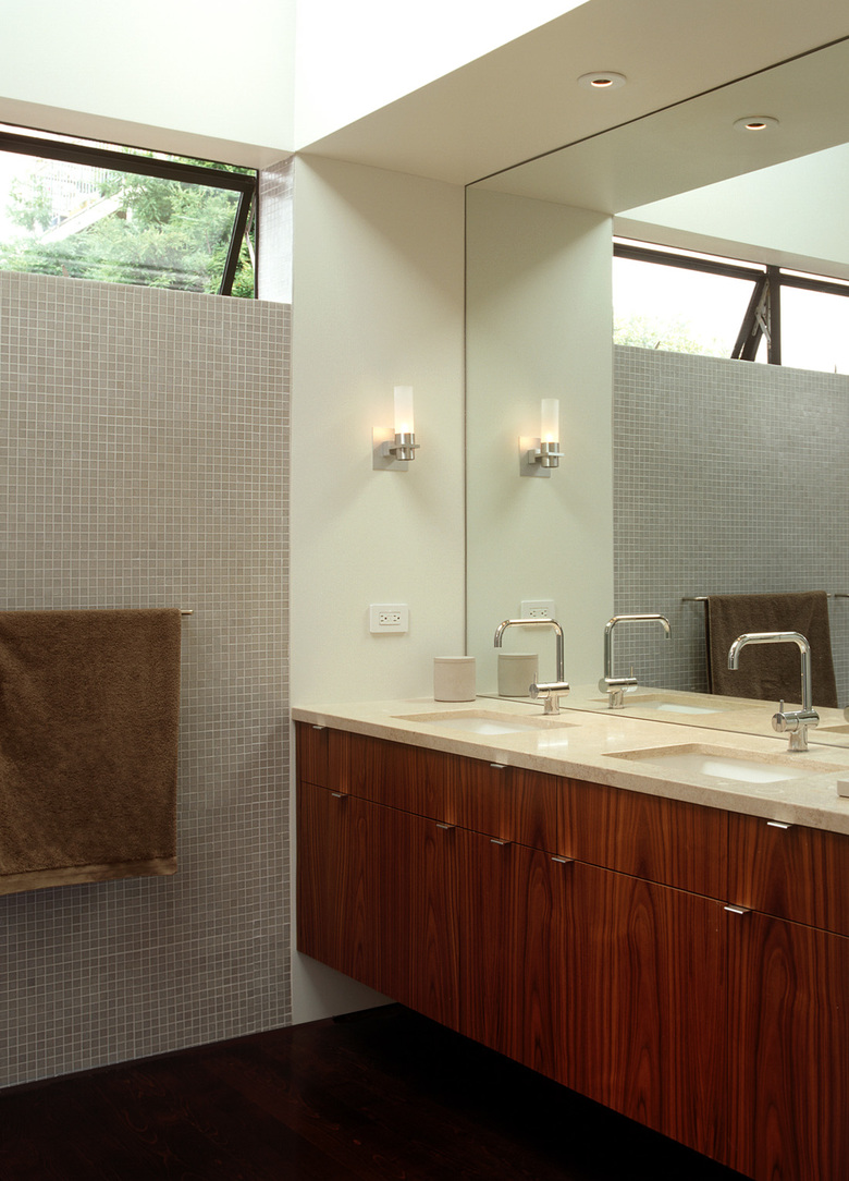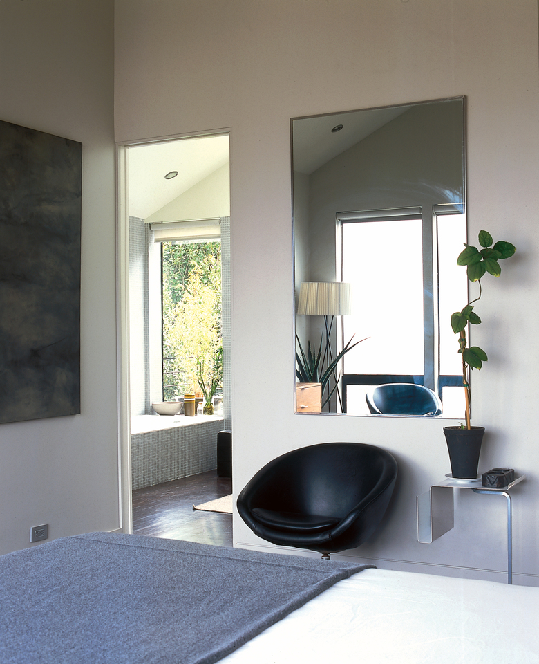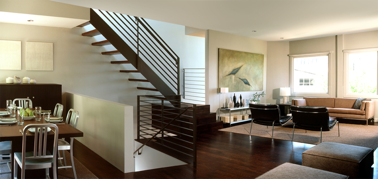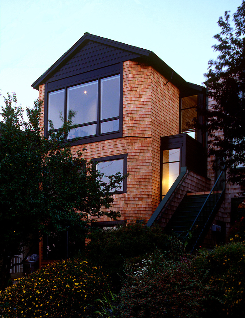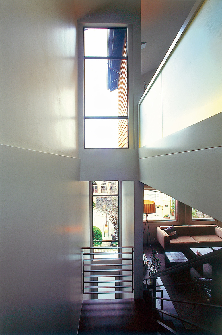 This project involved adding a Third Story to a small 1908 shingled house. The new third floor contains a Master Bedroom, Bathroom and Dressing Area with sweeping views of downtown San Francisco. By adding a glazed double-height extension to the front of the house the former dark, exterior walkway was turned into a light and welcoming Stair Hall. The new facade presents a seamless reconciliation between the older, shingled cottage and the interests of an open and modern aesthetic. Inside, a Platonic, steel-clad fireplace balances a sculptural steel stair. Walnut, limestone, acid-etched glass and glass mosaic tile add a warm and textured palette to the modern interior.
