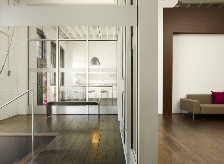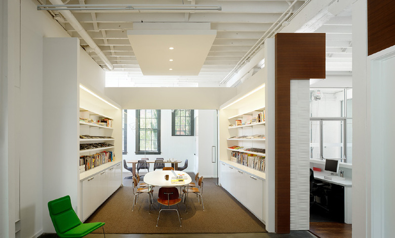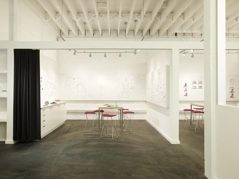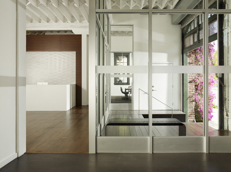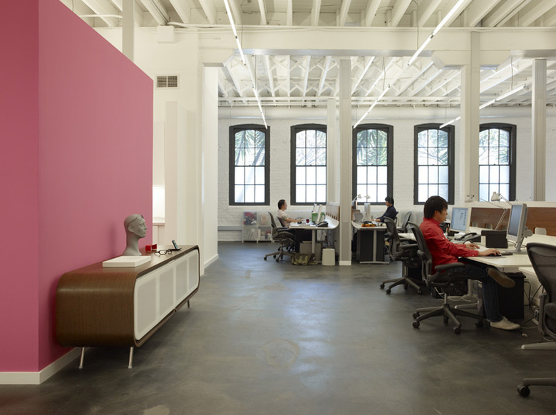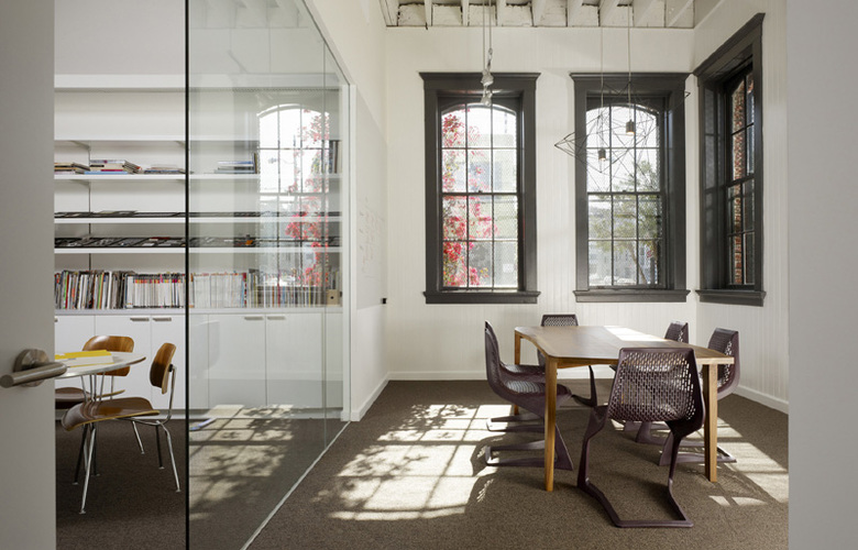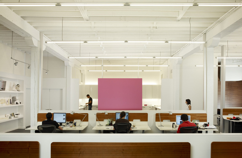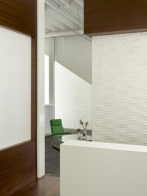 One & Co asked for an architectural identity to represent its industrial design studio while also expanding the space to serve its growing practice. The office is located in a turn-of-the-century brick warehouse in the Mission. The minimalist vocabulary of the new construction enhances the character of the older building and provides a range of visual and tactile experiences for the staff through essays on translucency, transparency, materiality, mass, texture, color and light. The neutral palette is punctuated by hot pink surfaces on the walls, floor and furniture which enliven the perception of depth. Products designed by One & Co are integrated into the architecture and interior design including the new Crease tile (a collaboration with Heath Ceramics), the Periodic Table, Aura credenza and Chrysalis stool for Council, and just-a-bench for Orange22.