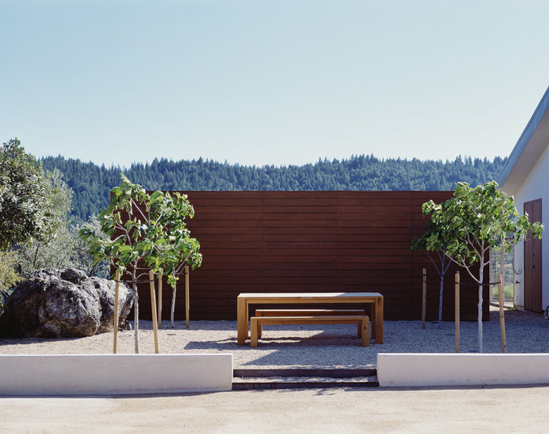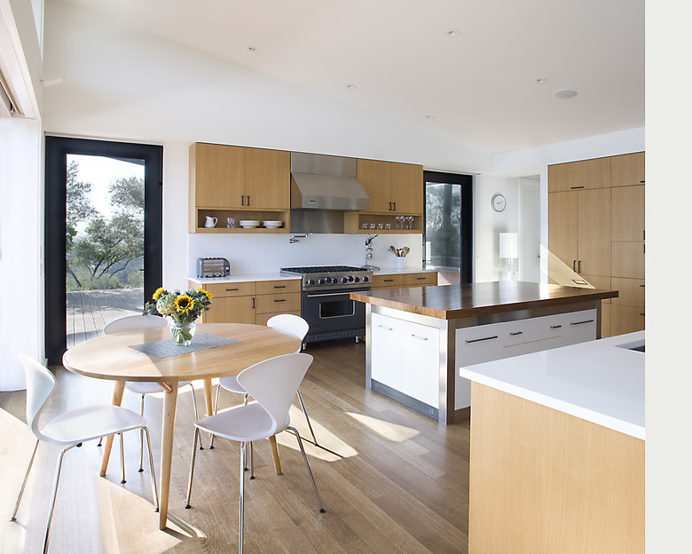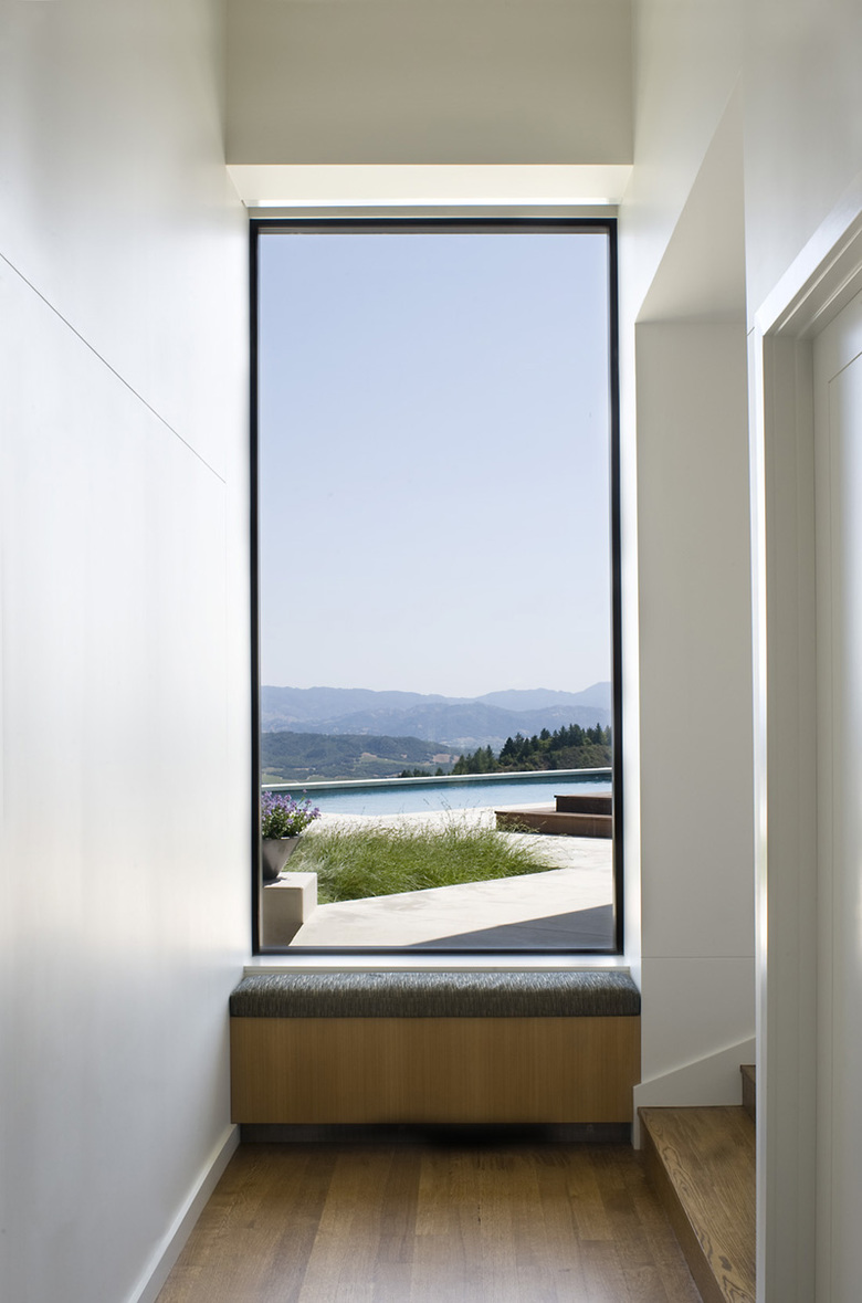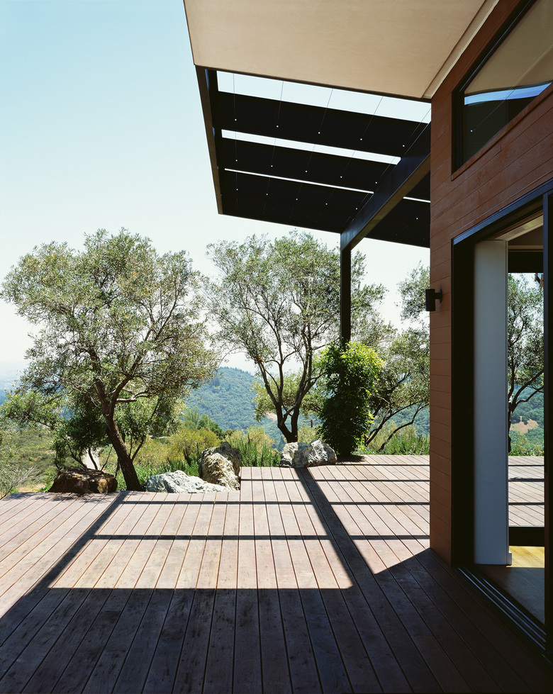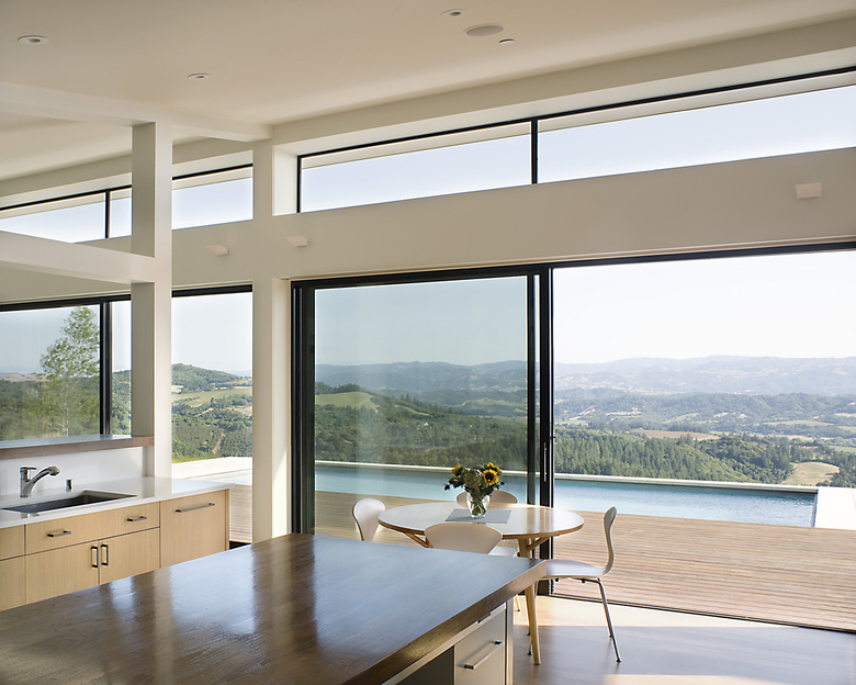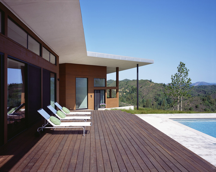 This 3,900sf house is sited on a north-facing ridge overlooking the Dry Creek Valley in Sonoma, California. The clients sought to create a gathering place which is modest in scale and presence yet large enough to accommodate visits by an extended family of life-long friends and their children. The site and climate required an architecture that tempers the seasonally intense sun and wind while still engaging the spectacular landscape and views. The form of the house is a riff on local agricultural (barn) and residential (ranch) typologies. The logic of the building envelope and its materiality relate to the accumulated wisdom of vernacular construction yet avoid imitation. Deflections in plan, section and elevation respond to the site topography and echo the rhythm of the ridge.