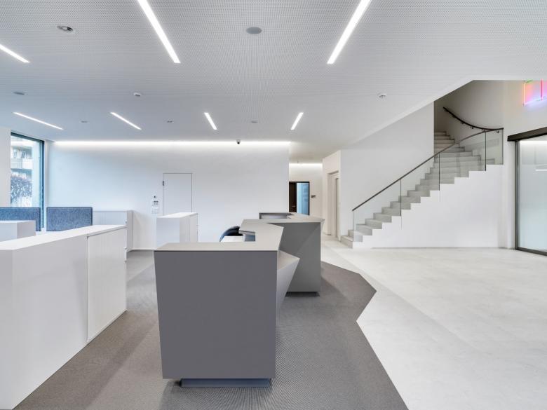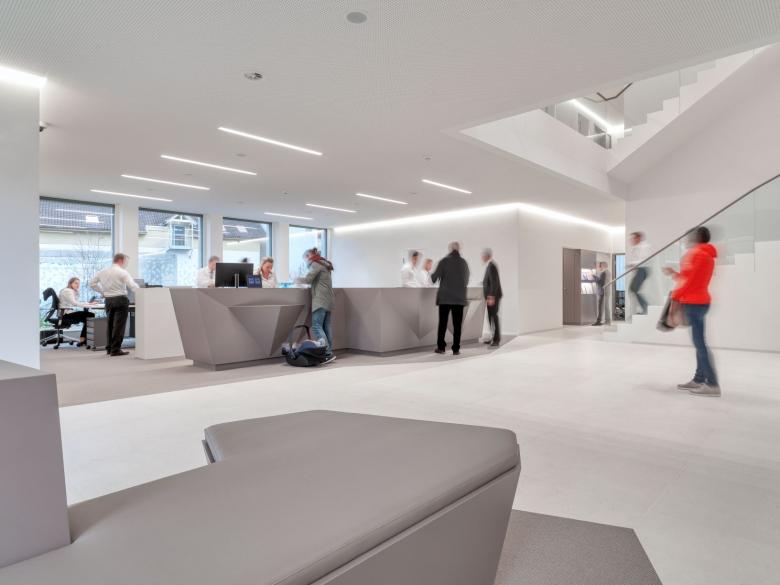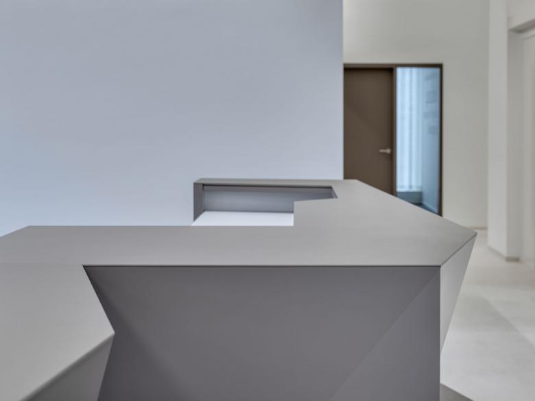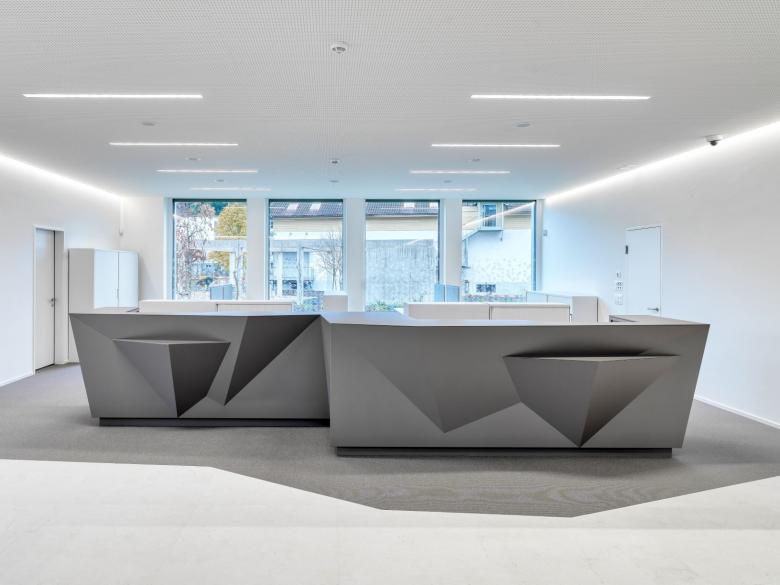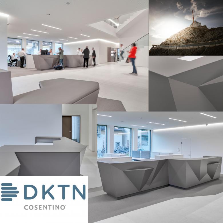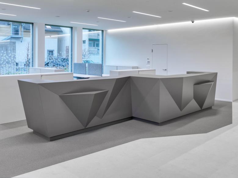 Eine starke lokale Identität ist der Clientis Bank in Oberuzwil wichtig. Der prägnante Empfangstresen verkörpert diesen Anspruch. Mit seinen präzise geformten Facetten verbindet er die Ästhetik der nahen Appenzeller Alpen mit dem vertrauensvollen Kundengeschäft. Die hochwertige Oberfläche besteht aus ultrakompaktem DKTN® von Cosentino.
