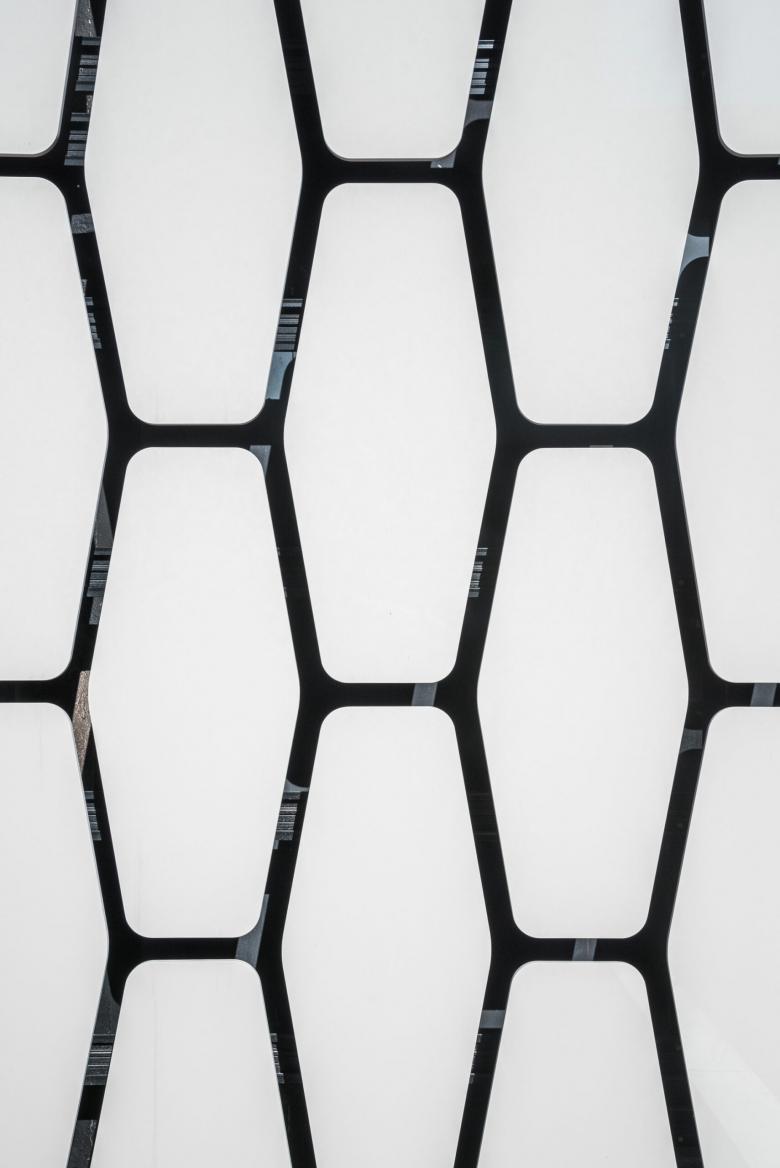 Die Hauptfassade des Hauptquartiers strahlt reines Licht ab. Die Sechsecke, die aus 600 m2 Dekton im Farbton Popular Warm hergestellt wurden, scheinen über der hinteren Fassade des Gebäudes zu schweben, die aus Dekton in dem dunklen Farbton Domoos abgerundet wird.