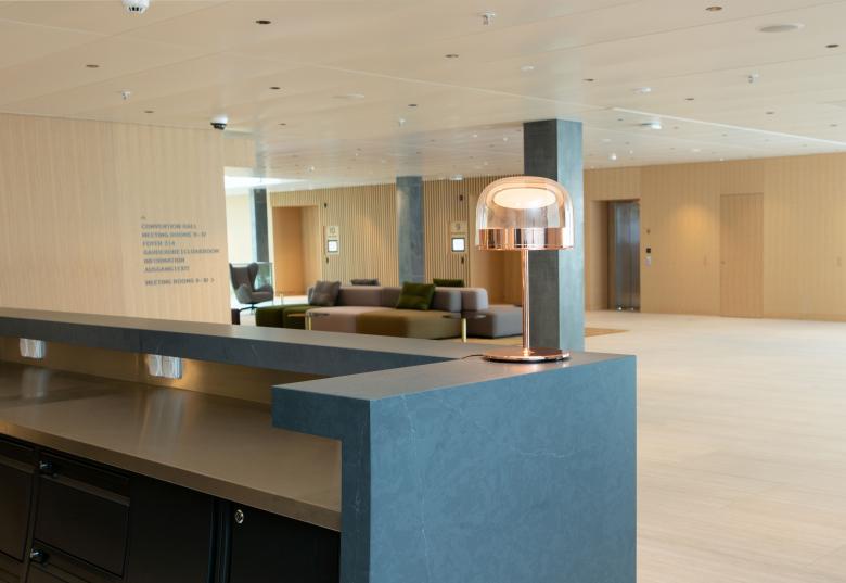 Inspiriert von der Natur und dem beliebten «Seifenstein», hat diese Oberfläche einen blau-grauen Farbton mit kräftigen, grauen Akzenten. Eine spektakuläre Kreation, die sich durch ihre Rundläufigkeit, Tiefe und besondere Dynamik auszeichnet. Genau das richtige Design für Hyatt Regency und das Convention Center.