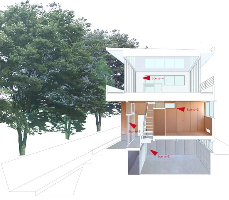 Scene-3 Private rooms on the first floor: These are a half-story above the entrance. The upper half of the exterior walls in these rooms are taken up by windows that run along the entire width of the house. These windows reveal a dense green belt, sharpening the residents’ awareness of the swaying leaves and the subtle changes in light and shade created by the trees.