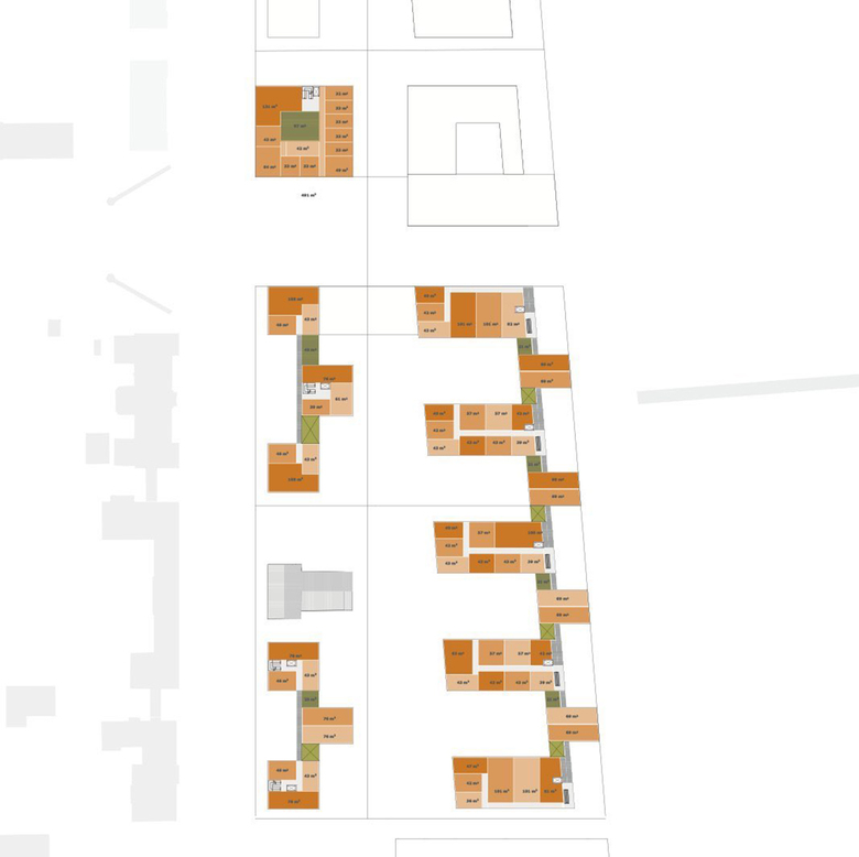 Die Durchlässigkeit des Quartiers mit den mehrfachen Querungen begünstigt die Kommunikation und die Integration in die heterogene Umgebung. Die Variationen der Anschlüsse an die bestehende Bebauung ermöglichen eine Einbindung in die bestehende Struktur.