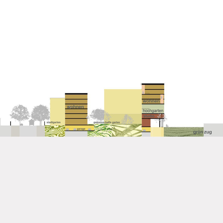 Der Strassenraum der Lehrter Strasse wird nicht nach gründerzeitlichem Muster mit Blockrandbebauung gefasst sondern bleibt im Erscheinungsbild als Enklave mit seiner Mauer und dem Dahinter erhalten. Die Bebauung erstreckt sich parallel zur Strasse in Schichten, die zur Bahn hin ansteigen und von den Querungen unterbrochen werden.