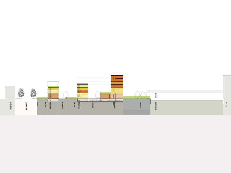 Der Strassenraum der Lehrter Strasse wird nicht nach gründerzeitlichem Muster mit Blockrandbebauung gefasst sondern bleibt im Erscheinungsbild als Enklave mit seiner Mauer und dem Dahinter erhalten. Die Bebauung erstreckt sich parallel zur Strasse in Schichten, die zur Bahn hin ansteigen und von den Querungen unterbrochen werden.