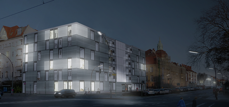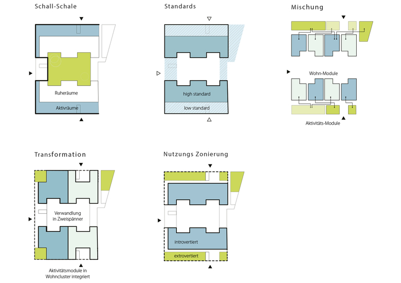 Der viergeschossige Baukörper markiert als Eckbaustein den Übergang zwischen Blockrand und offener Bebauung entlang der Amrumer Strasse. Die funktionale Organisation der Nutzungseinheiten sieht eine Orientierung der Individualräume in den Wohnkernen zum geschützten, ruhigen Innenhof bzw. abgerückt von der stark befahrenen Amrumer Strasse vor.