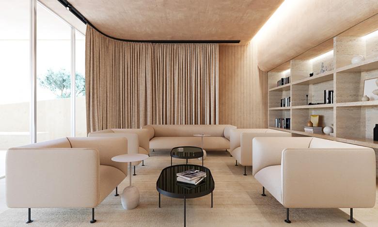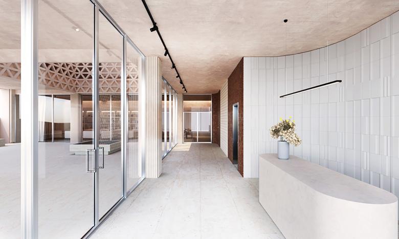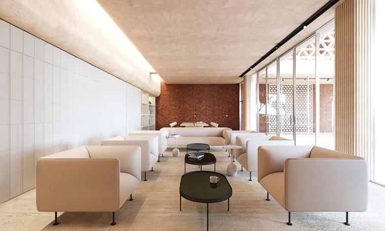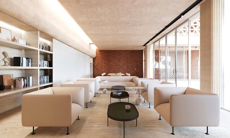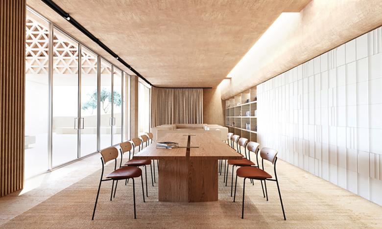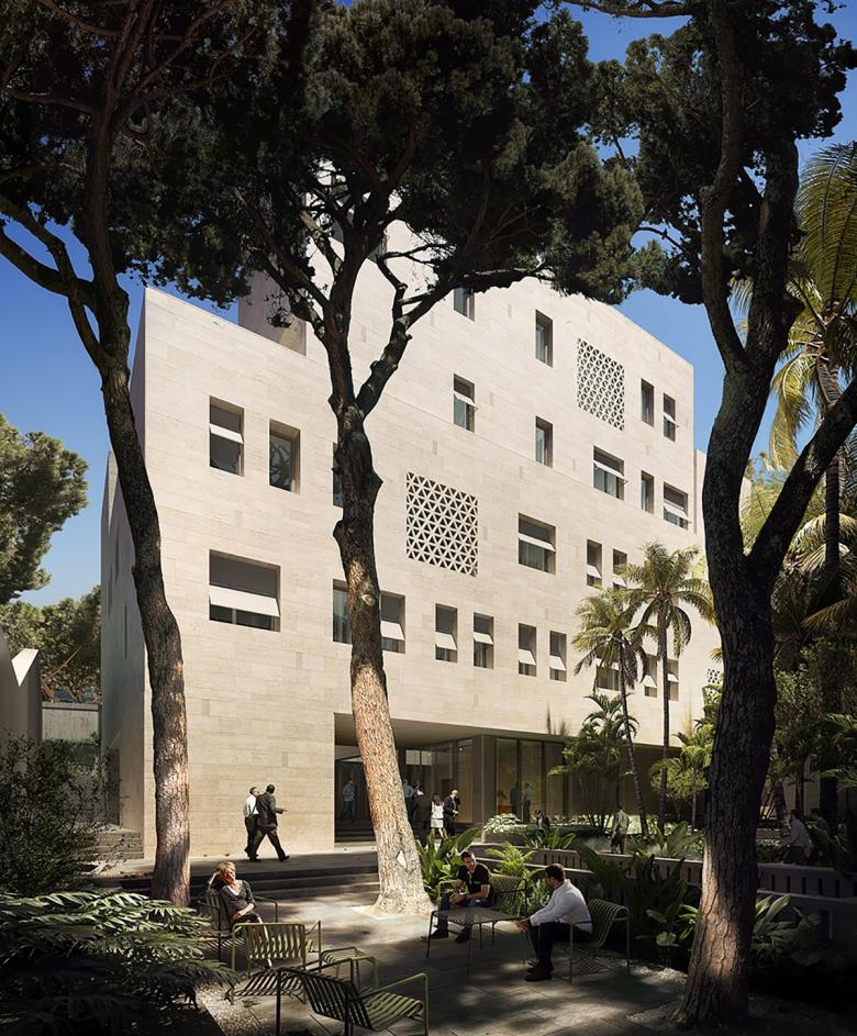 A representative garden is adjacent to the public areas of the building. This may serve as an area for meditative strolls as well as an event space. Intensive greenery is designed to protect from overheating and blazing sunshine.