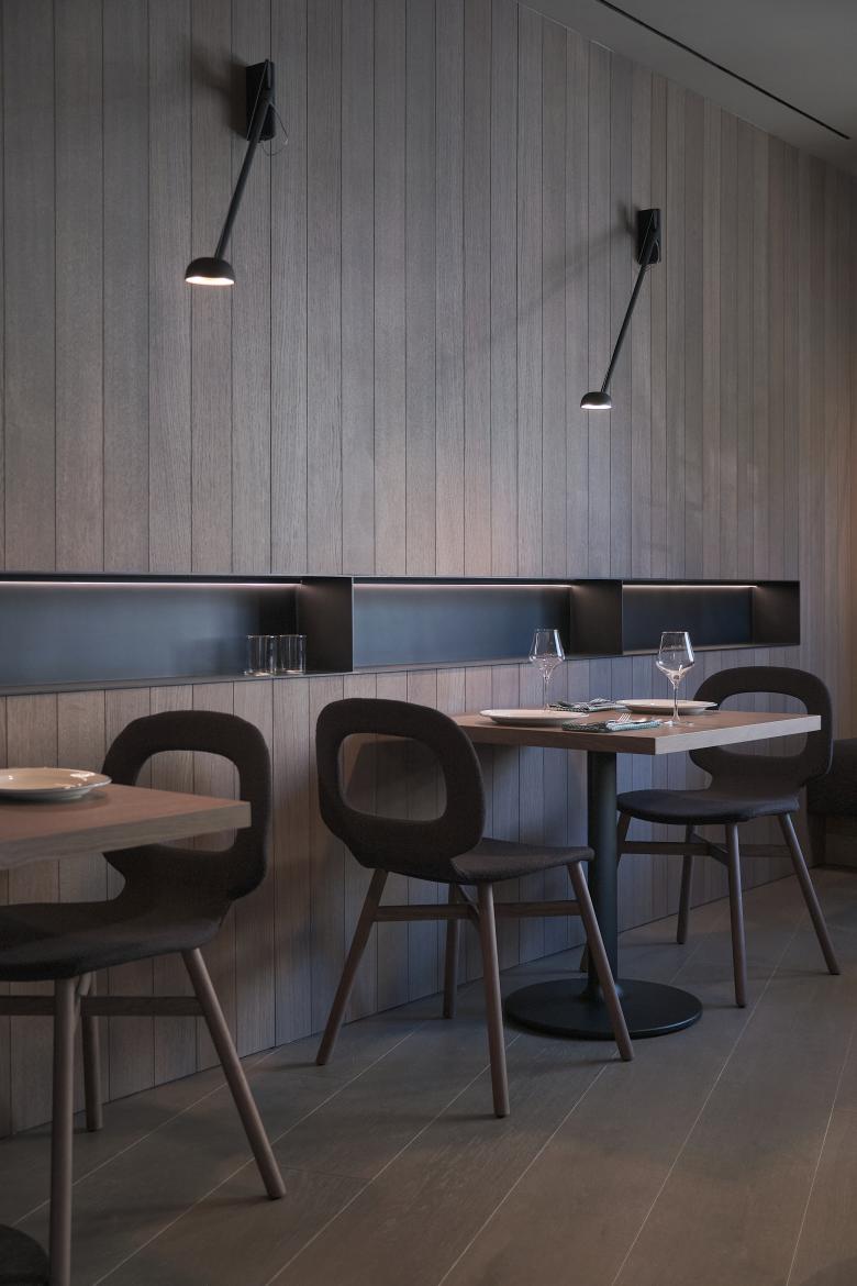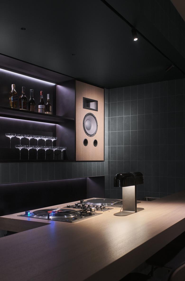 This dialogue also incorporates a small area dedicated to sound. Vinyl records and the audio system do not appear as decorative elements, but as another layer of the project. Music accompanies the experience and helps to build an atmosphere in which food and space move at the same pace. The result is a compact, urban design that remains faithful to the philosophy of the restaurant.