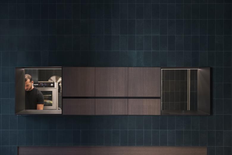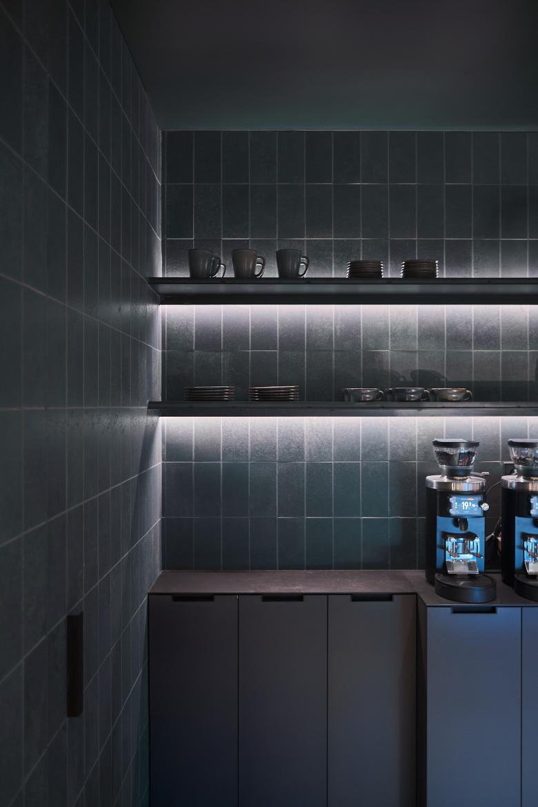The kitchen is integrated into the space through controlled openings, establishing a direct relationship with the guest without being fully exposed. The process becomes part of the atmosphere and reinforces a close, approachable experience. Despite the reduced surface area, the project is resolved through an exercise in order and integration. Behind the bar, every centimetre is used to organise tableware, glassware and service elements.