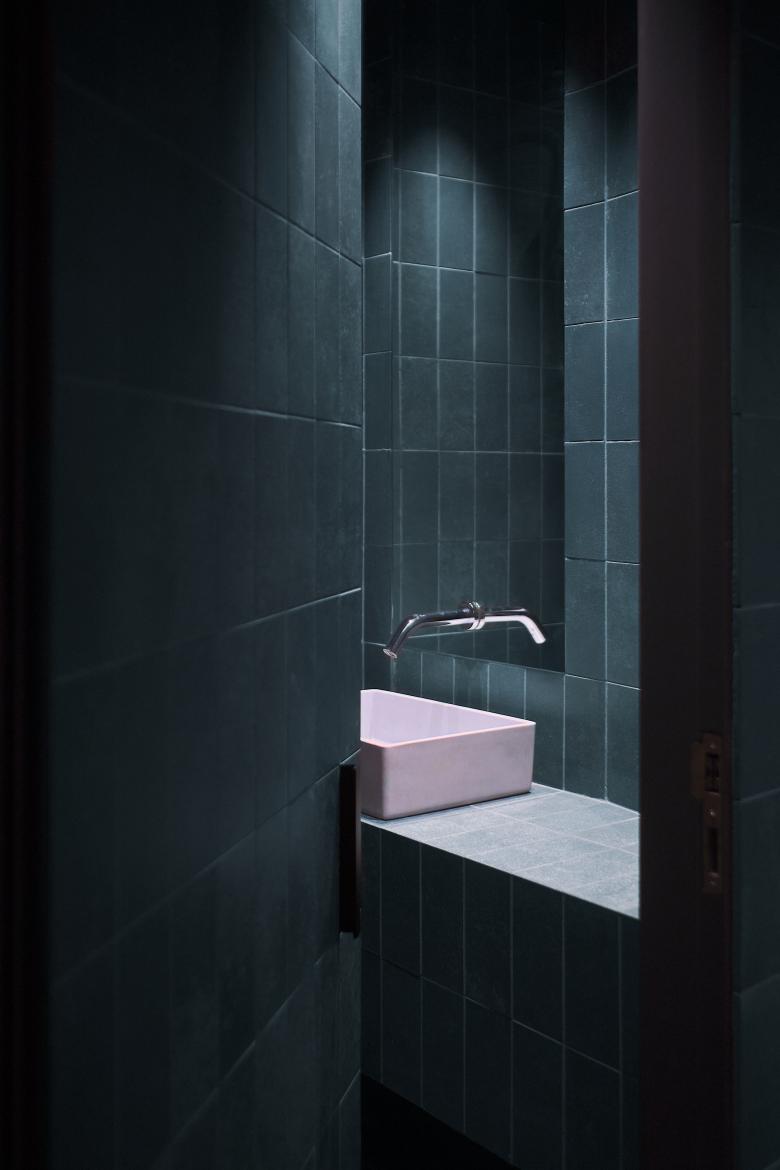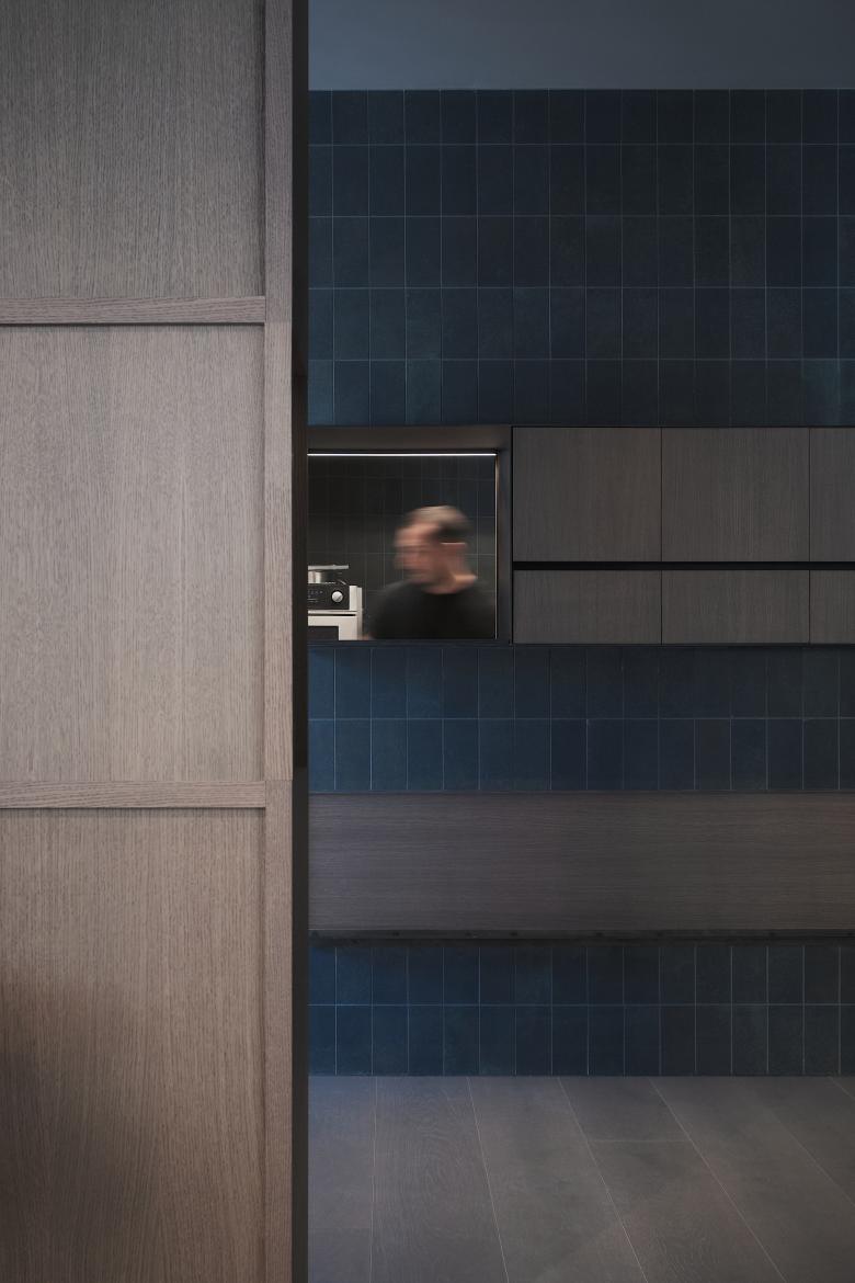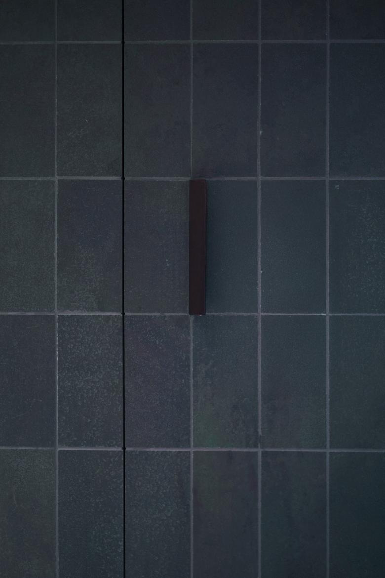 Materiality responds to a restrained attitude. Green tiles from the Fe collection, designed by Francesc Rifé Studio for Nadis, cover walls and floors through a carefully planned layout that discreetly integrates both the kitchen access door and the bathroom doors, which remain almost invisible when closed. Oak wood, applied in narrow slats, introduces rhythm and warmth while integrating storage and technical surfaces without disrupting the visual continuity of the space.