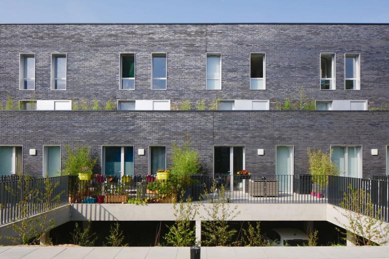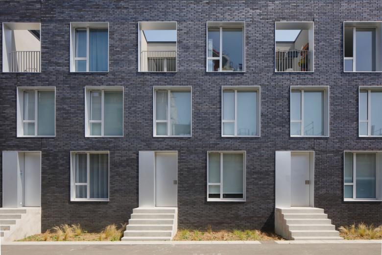 Careful work has been carried on the thresholds and entrance sequences. The “townhouses” with individualized access are raised from the street, and set apart by a planted setback of 2.30m, which allows to preserve a certain intimacy for the dwellings while offering a landscape quality to the urban space.