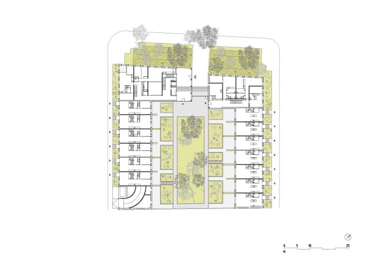 The heart of the block is thought of as a large garden developing sequences from the most private to the most collective. The creation of a planted slope at the interface of the semi-underground car park and the deck allows private spaces and shared spaces to coexist in a search for living together.