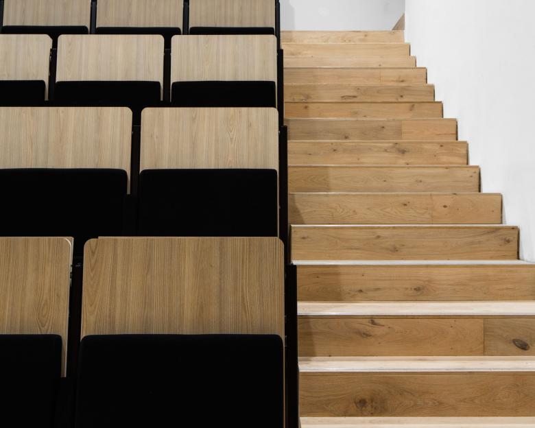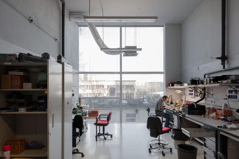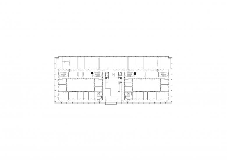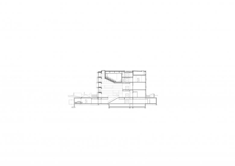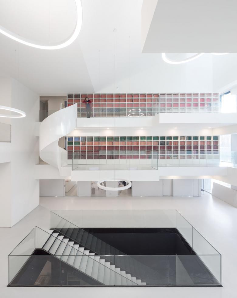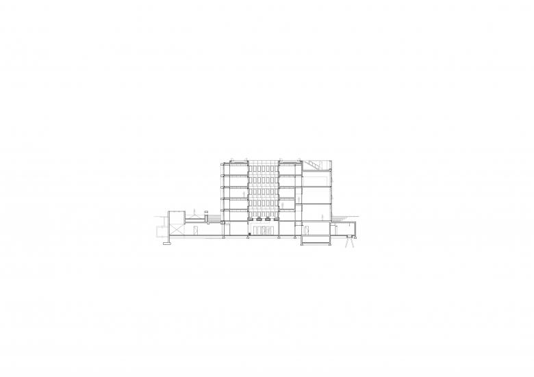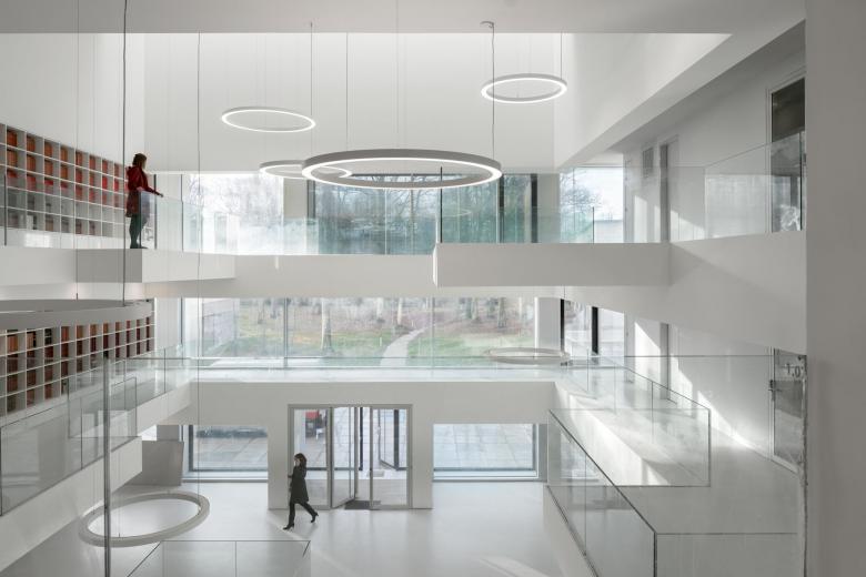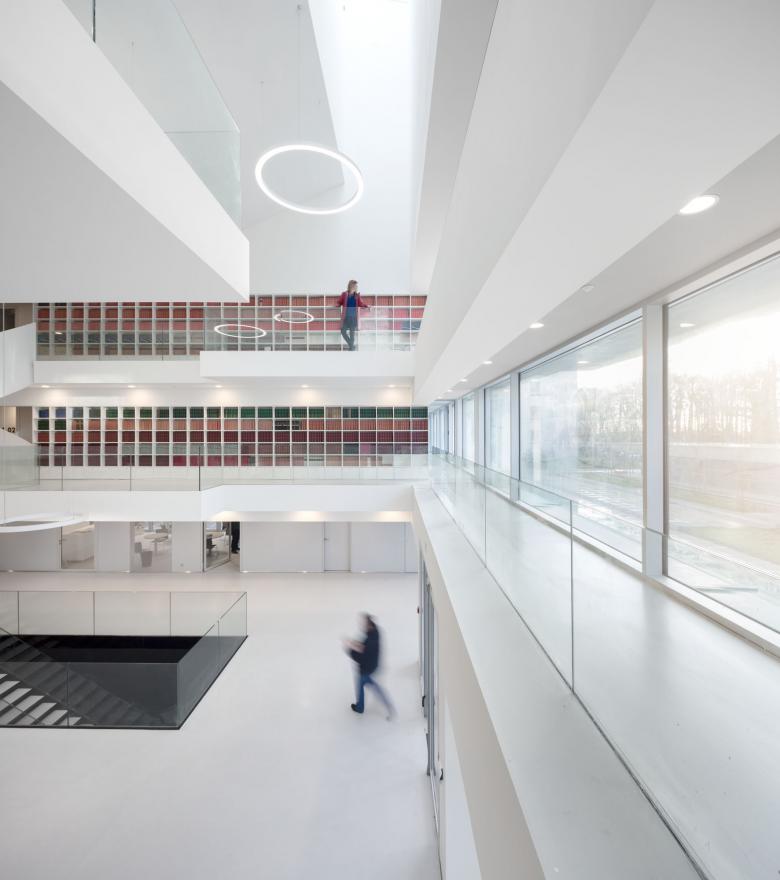 Le bâtiment peut être divisé en trois zones: une partie recherche, administration et communication. Celles-ci se situant sur un socle regroupant les services.