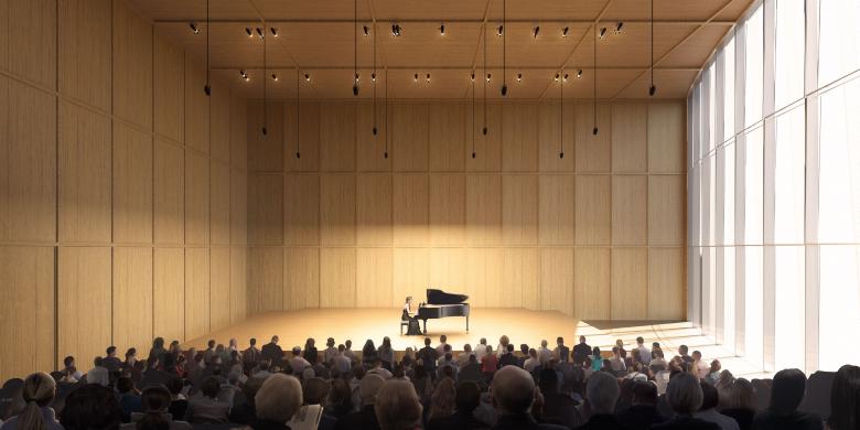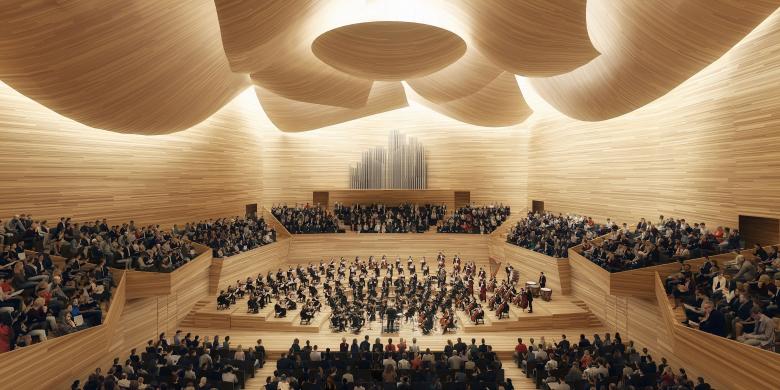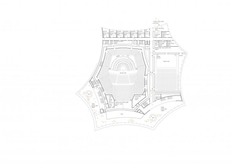The Grand Hall, a precise acoustical jewel sculpted for classical music, can host from 1500 to 1700 seats. The Grand Hall is shaped in a vineyard layout, which suits the idea of sharing music evenly, between the performers and listeners, in all directions. The Grand Hall folllows an introverted concentric organization where listeners are envelopping the stage on all sides.