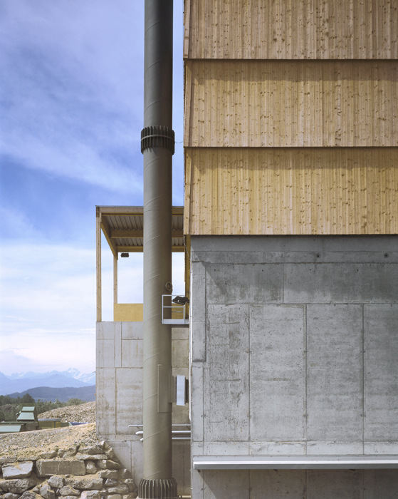 Im vorderen Gebäudeteil – der Stromerzeugung – befindet sich neben dem Steuerungsraum ein Traforaum. Dahinter ist das Heizwerk mit Beschickung, Heizofen und Rauchgasreinigung angeordnet. Über dem 7,5m hohen Betonsockel erhebt sich eine Holzkonstruktion aus Fichten- und Tannenholz, welche fassadentechnisch mittels überdimensionalen Holzschindeln beplankt ist.