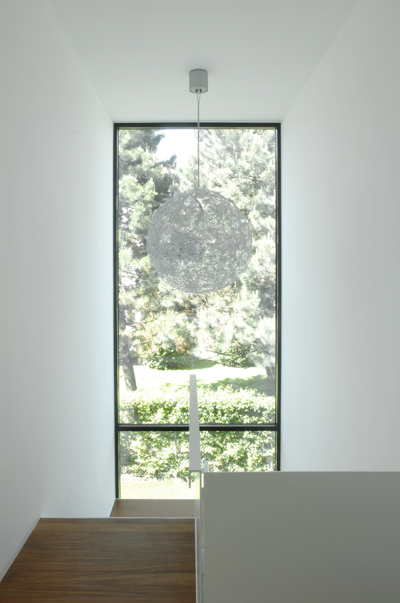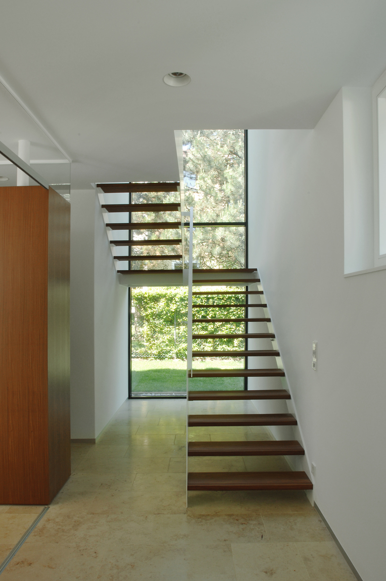 Das offene Stiegenhaus mit haushoher Fixverglasung, nach Norden hin ausgerichtet, bildet eine Fluchtachse vom Eingang aus und vermittelt ein Gefühl von Freiheit in den eigenen vier Wänden.